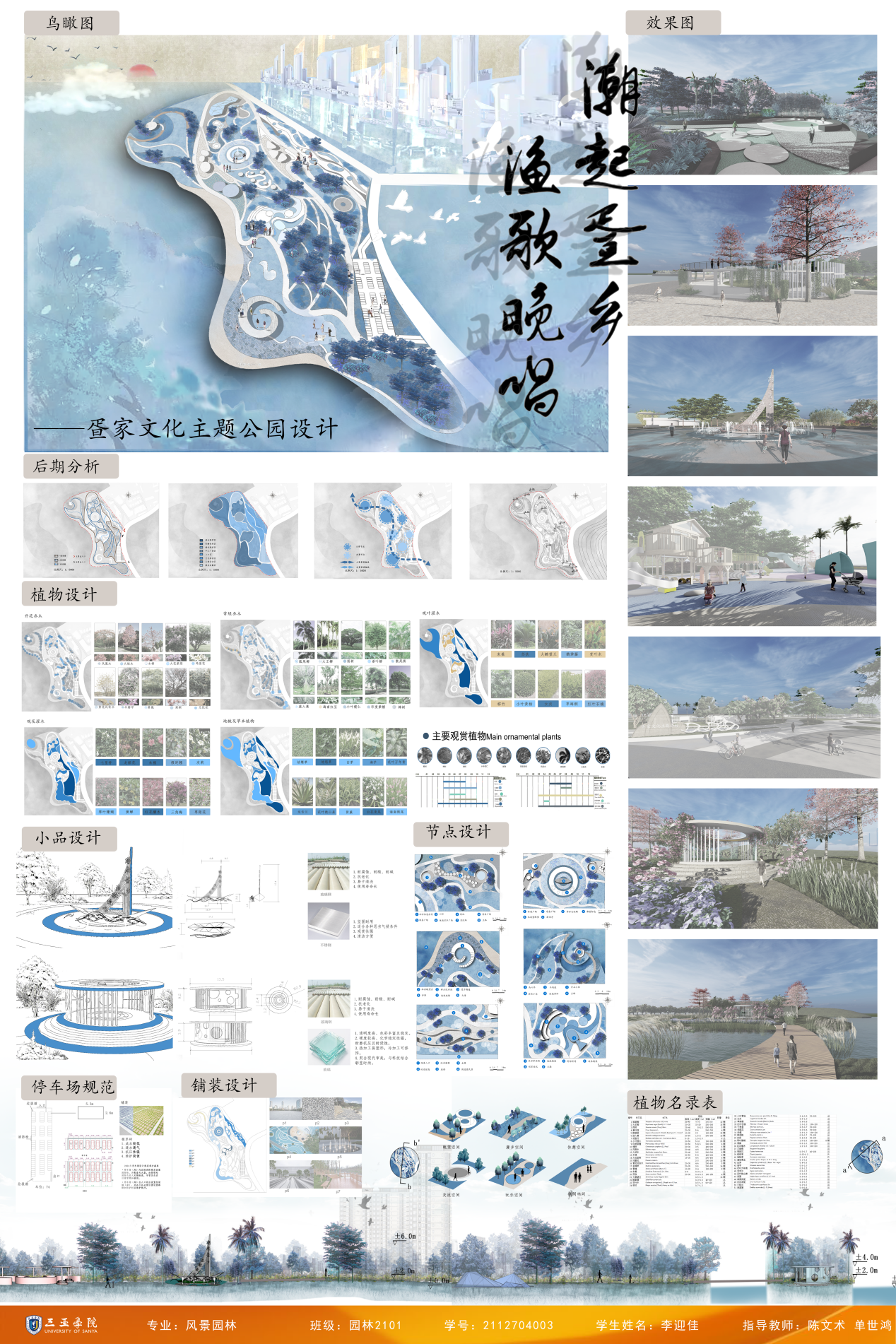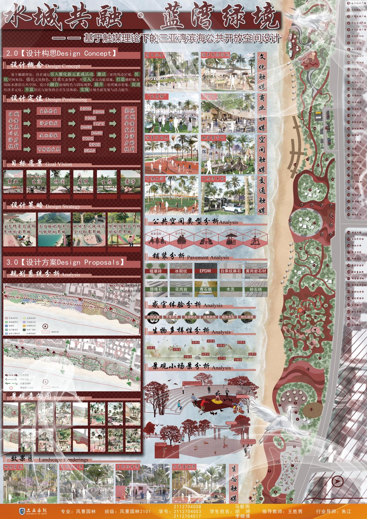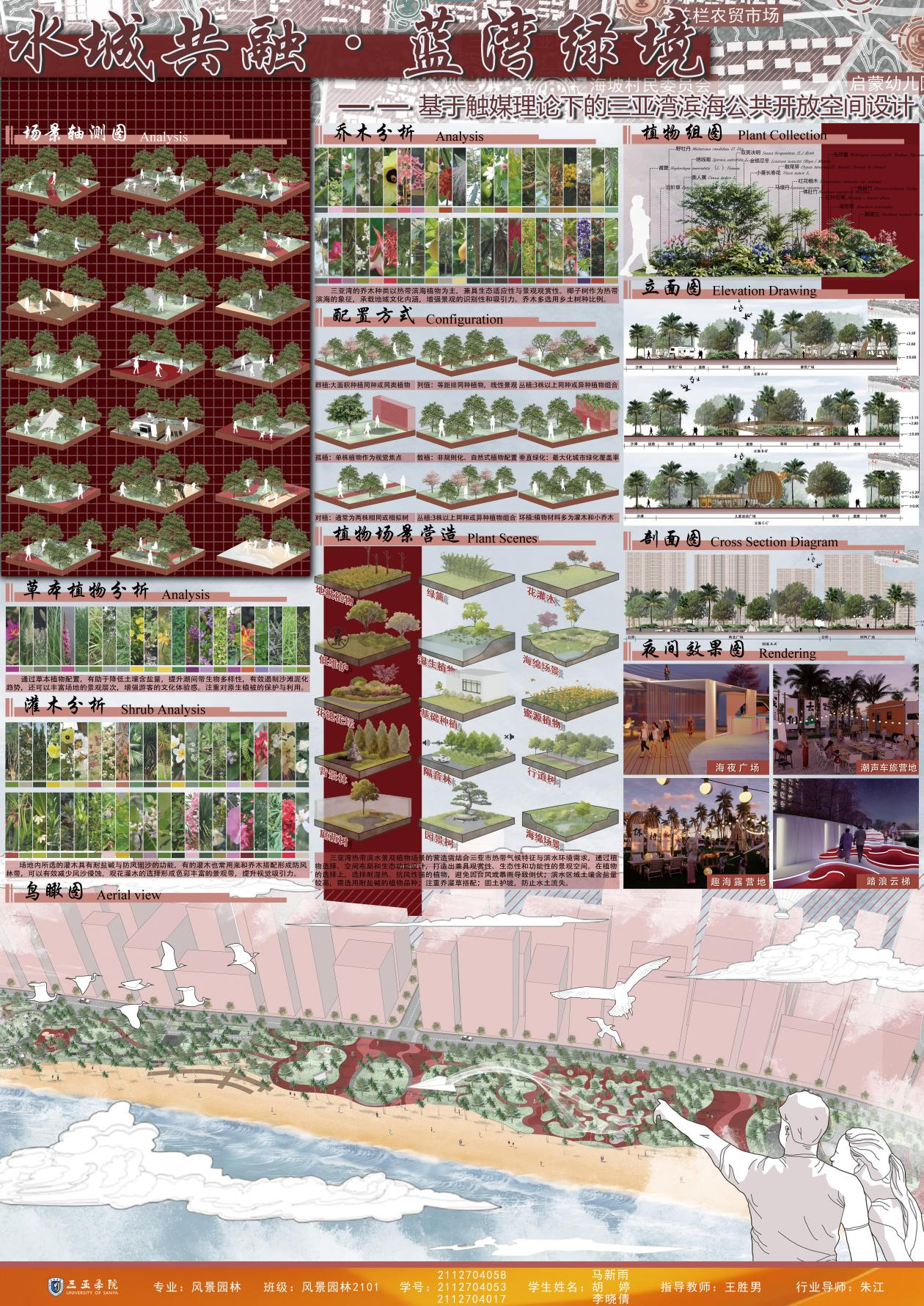 毕业生作品中涌现出诸多亮点:《潮起疍乡,渔歌晚唱——疍家文化主题公园设计》通过梳理历史脉络,构建古今对话的景观叙事空间;《红林宸居——基于LID理论的生态性三亚市大茅河滨水绿地改造设计》提出“低干预、自适应”的生态设计框架;《触摸城市温度—以情感需求为导向的适老化社区公园设计》则聚焦老龄化社会需求,探索人性化适老空间。评委组认为,学生作品既体现了扎实的专业功底,又彰显了当代青年设计师的社会责任感。