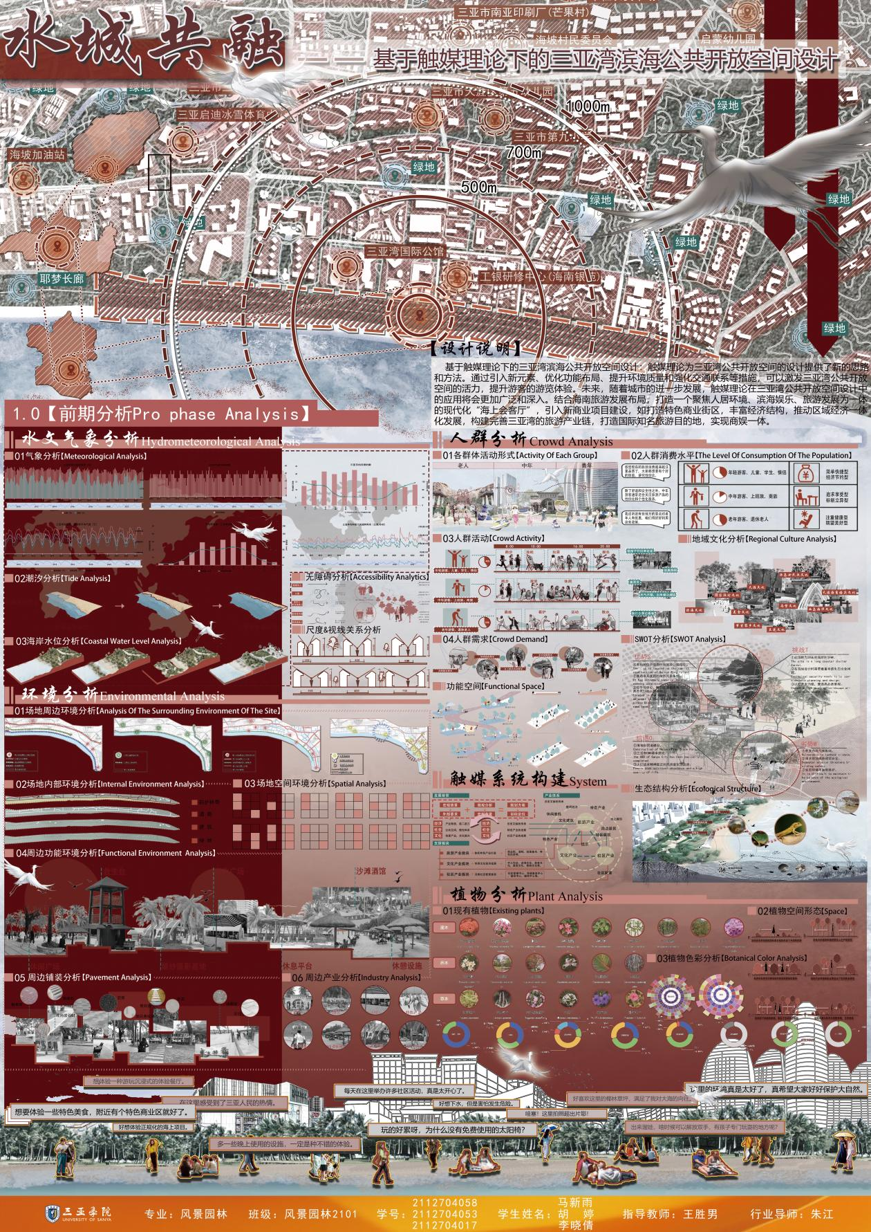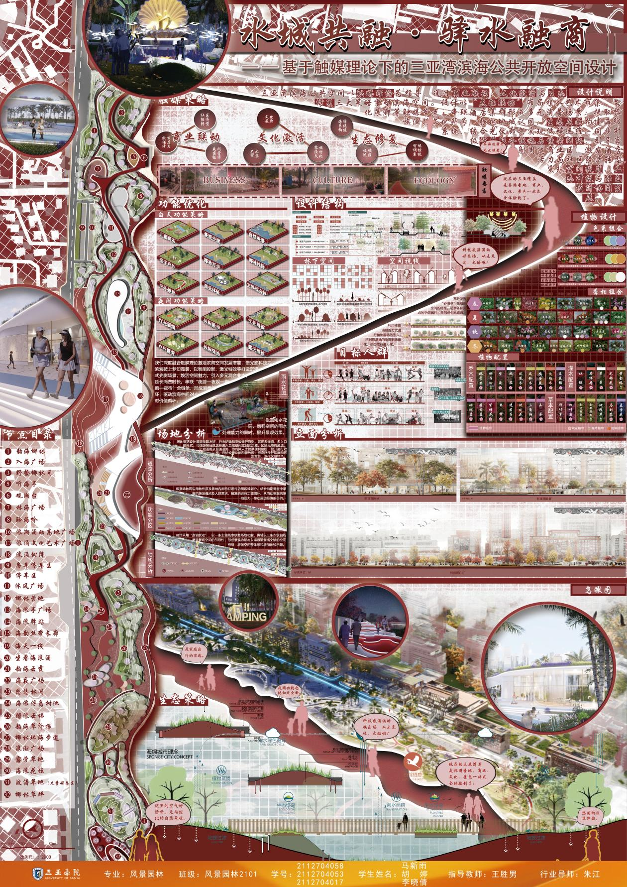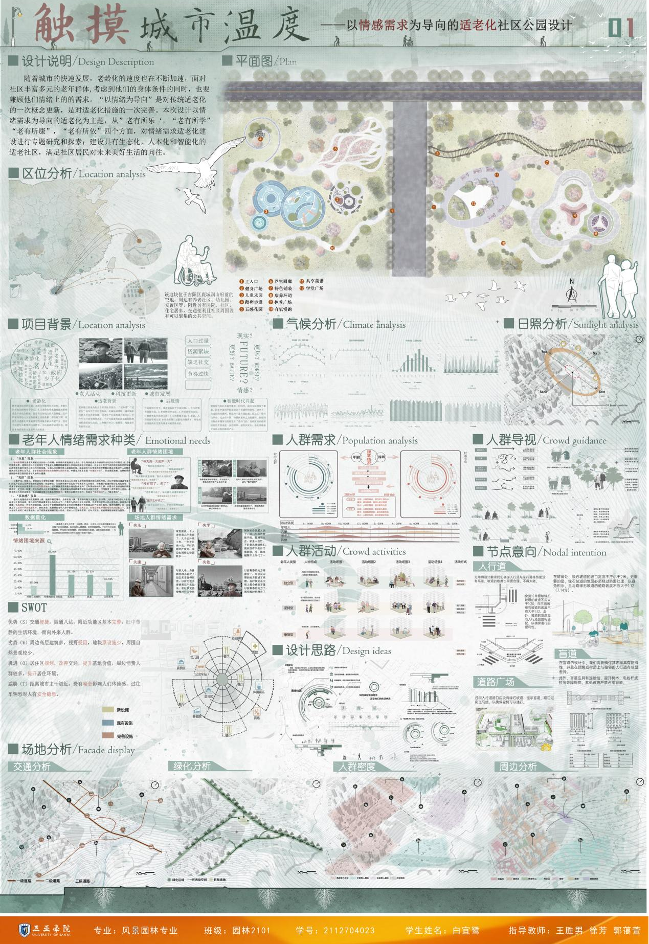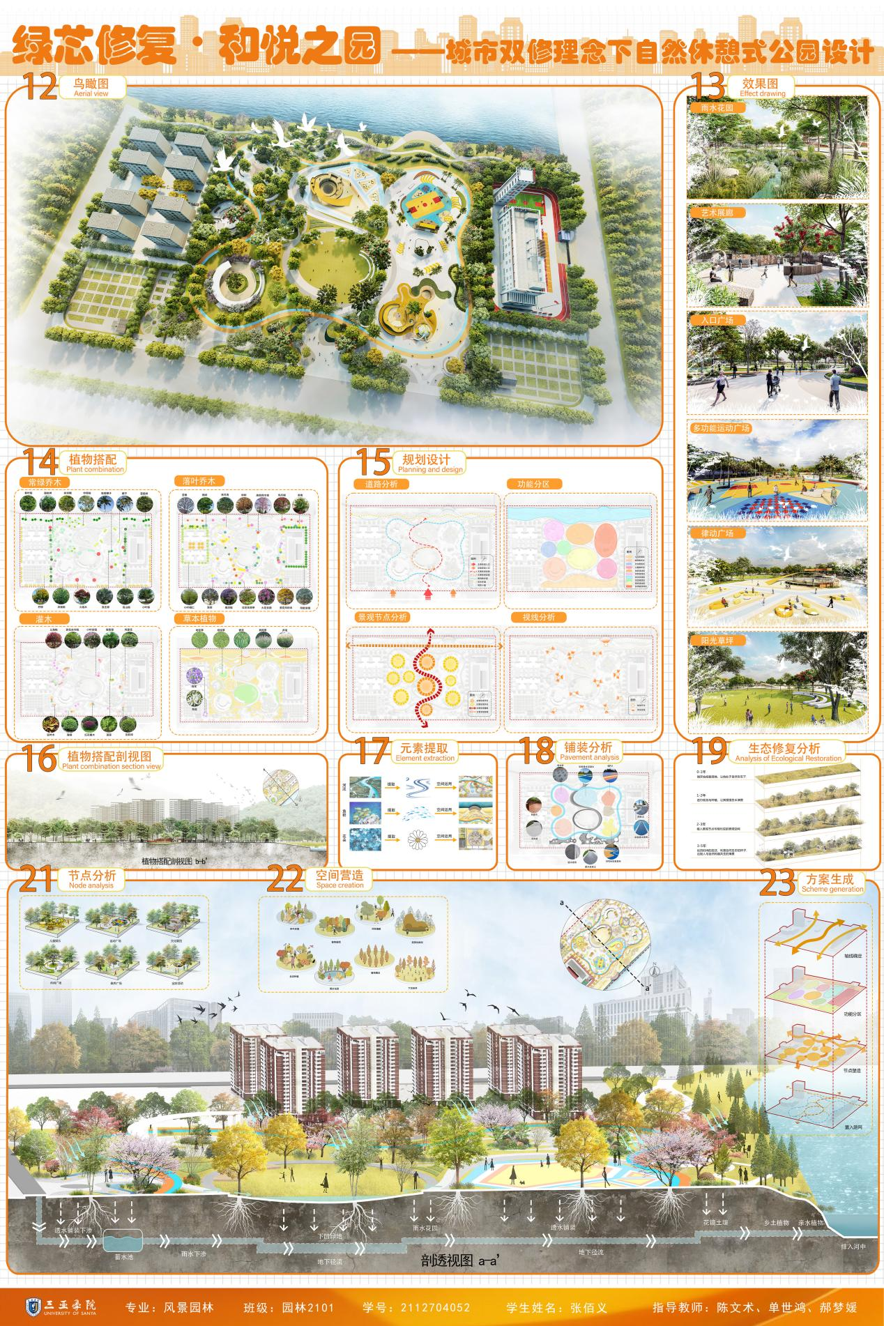 毕业生作品中涌现出诸多亮点:《潮起疍乡,渔歌晚唱——疍家文化主题公园设计》通过梳理历史脉络,构建古今对话的景观叙事空间;《红林宸居——基于LID理论的生态性三亚市大茅河滨水绿地改造设计》提出“低干预、自适应”的生态设计框架;《触摸城市温度—以情感需求为导向的适老化社区公园设计》则聚焦老龄化社会需求,探索人性化适老空间。评委组认为,学生作品既体现了扎实的专业功底,又彰显了当代青年设计师的社会责任感。