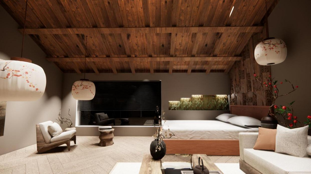 在材料运用上,“崖韵悠舍”充分体现了“天人合一”的设计思想。设计大量使用了木质、石质、布艺等天然材料,营造出温馨、宁静的居住氛围。木质材料用于天花板、床架和家具,石质材料用于背景墙和地面铺设,布艺材料则用于沙发、窗帘等软装,这些材料的选择不仅体现了自然之美,也赋予了空间深厚的人文气息。