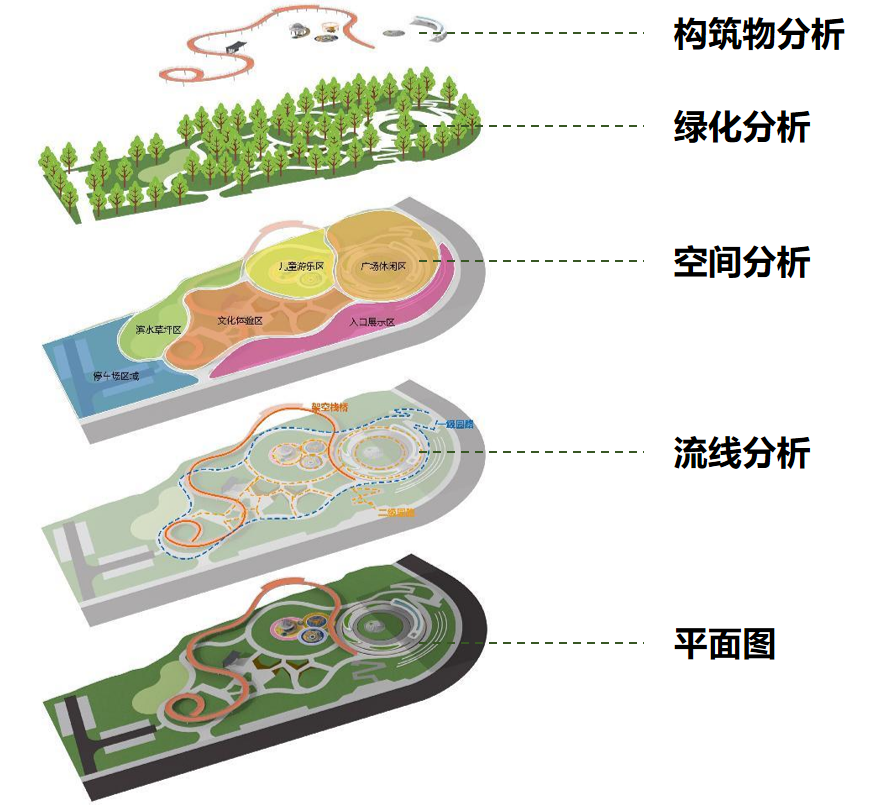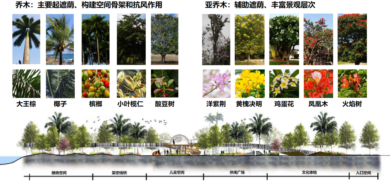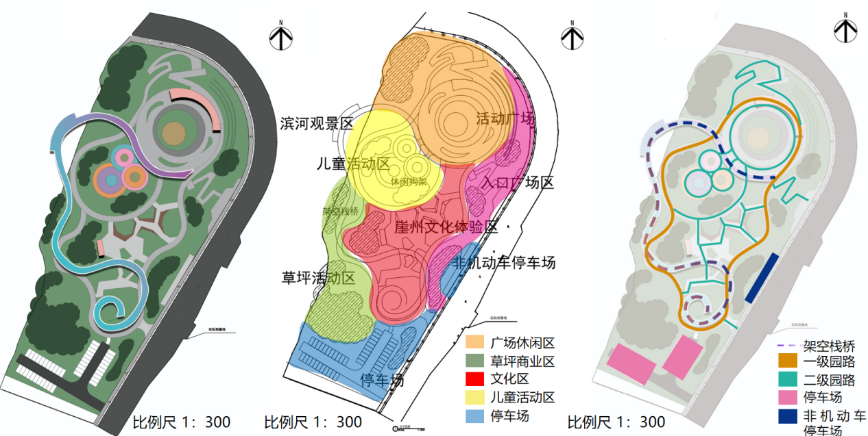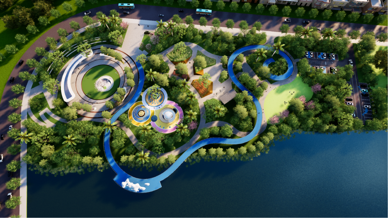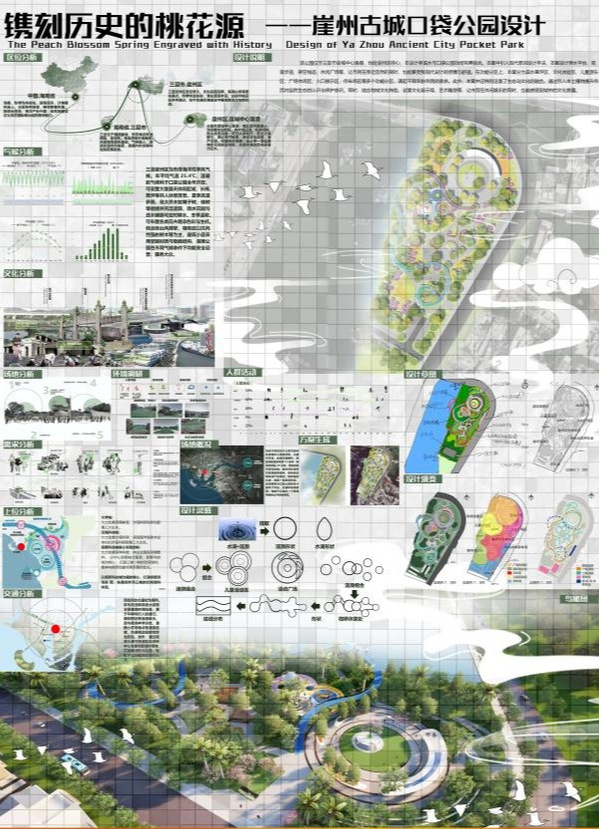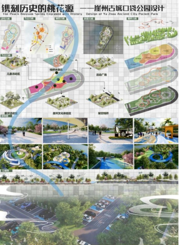 设计以“镌刻历史的桃花源--崖州古城口袋公园设计”为主题,提取“水滴+涟漪”符号贯穿空间布局,形成“一轴多核”结构——以文化体验轴串联入口展示、儿童游乐、滨水草坪等六大功能区。同时,遵循《口袋公园建设指南》生态要求,采用透水铺装、雨水花园、下沉式绿地等技术,构建年径流控制率达85%的海绵系统;植物配置以三角梅、凤凰木等20余种本土物种为主,形成“乔木-亚乔木-灌木-地被”四层垂直生态,降低30%养护成本的同时增强生物多样性。