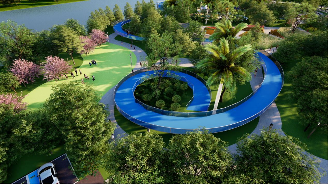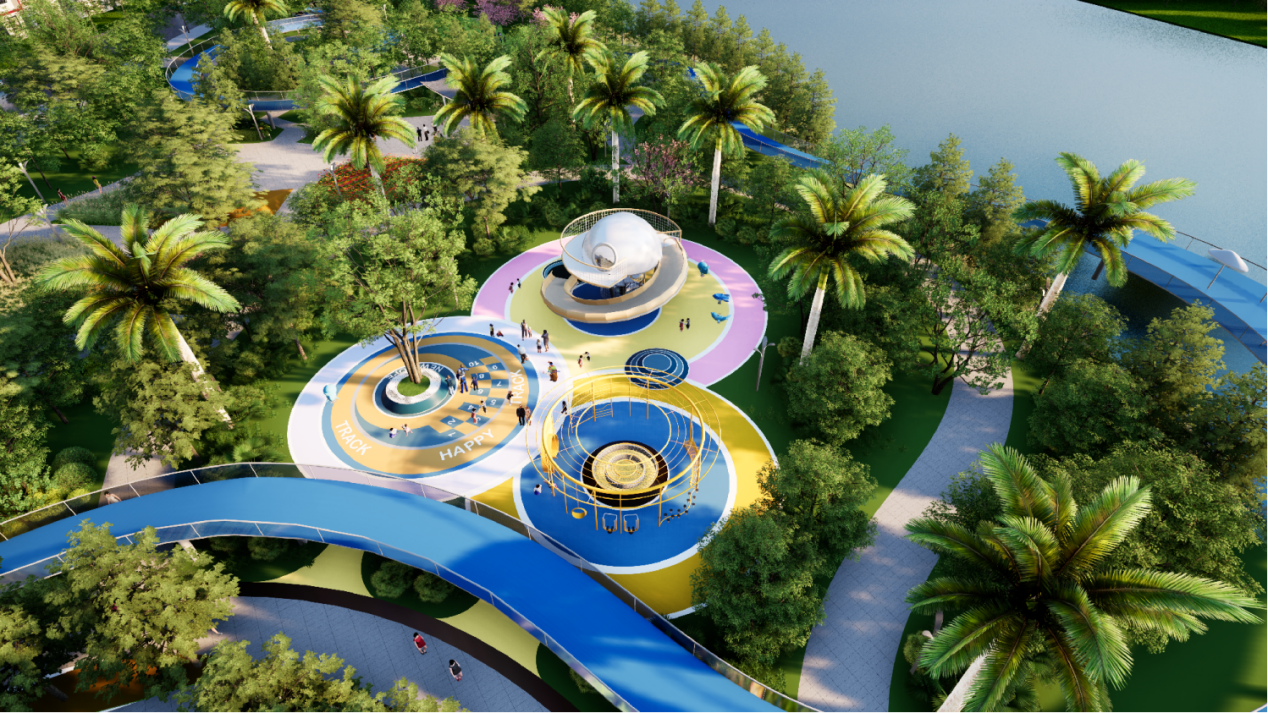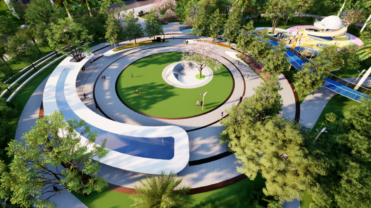 针对3-12岁儿童,划分“攀爬探索区”与“认知互动区”。螺旋型金属攀爬景墙融入黎族图腾纹样,彩色塑胶地面嵌入压力感应音符装置,搭配朱槿、龙船花等无毒花卉,激发儿童感官发育;树池坐凳与植物科普牌结合,形成“游玩 +教育”复合场景,家长休息区同步配置充电设施,兼顾亲子需求。