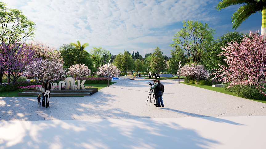 主入口以三亚市花三角梅为核心景观,搭配粉萼鼠尾草形成粉色花带,结合洋紫荆、黄槐决明遮荫乔木,构建多层次绿化界面。开放式广场与艺术化“PARK” 标识形成视觉焦点,日均人流量承载能力提升40%,成为古城的 “绿色会客厅”。
