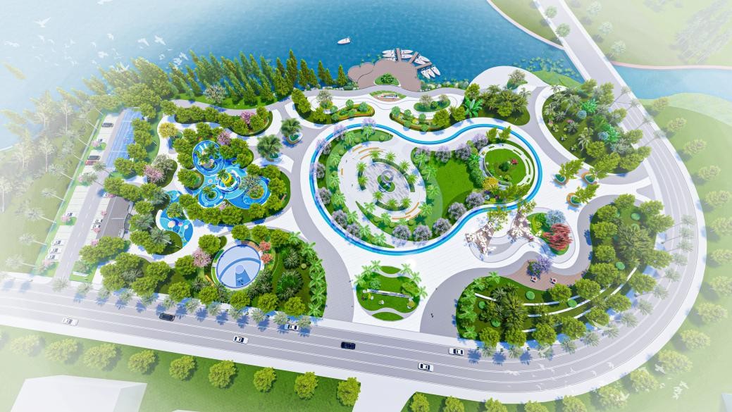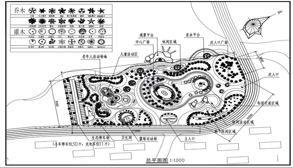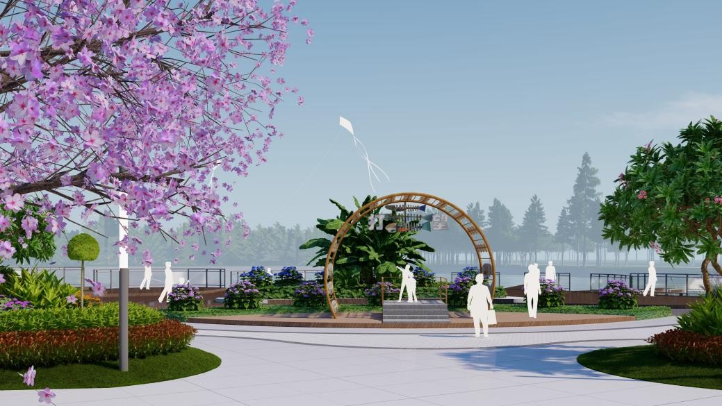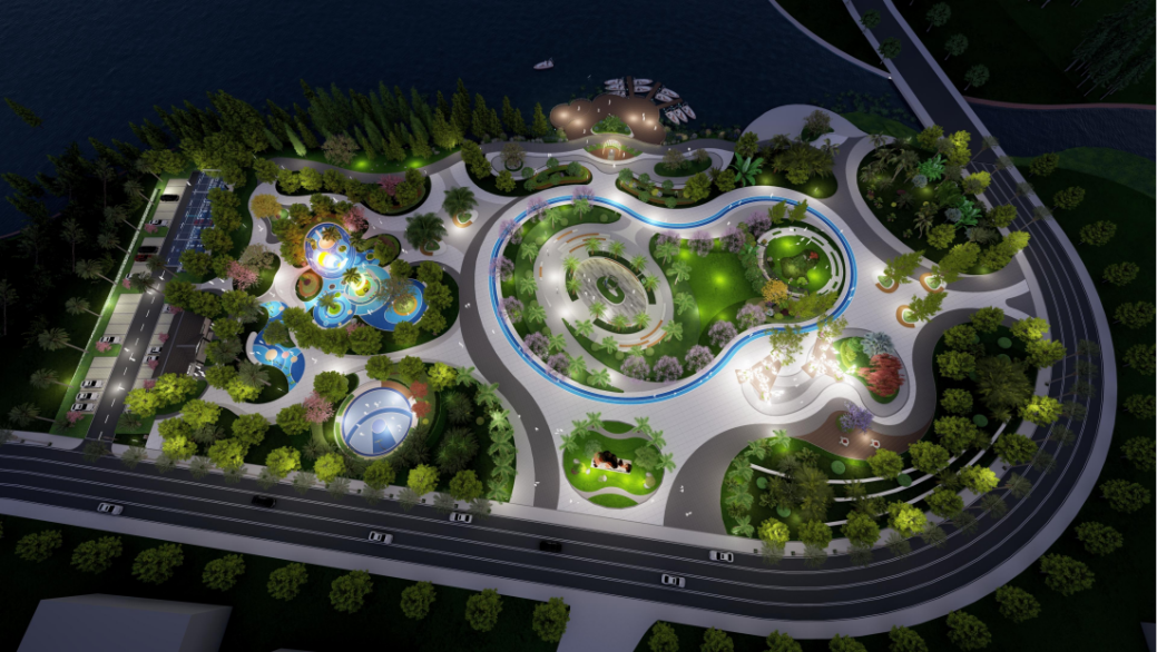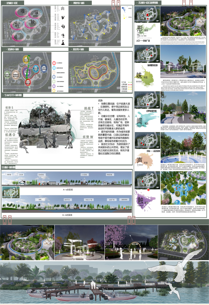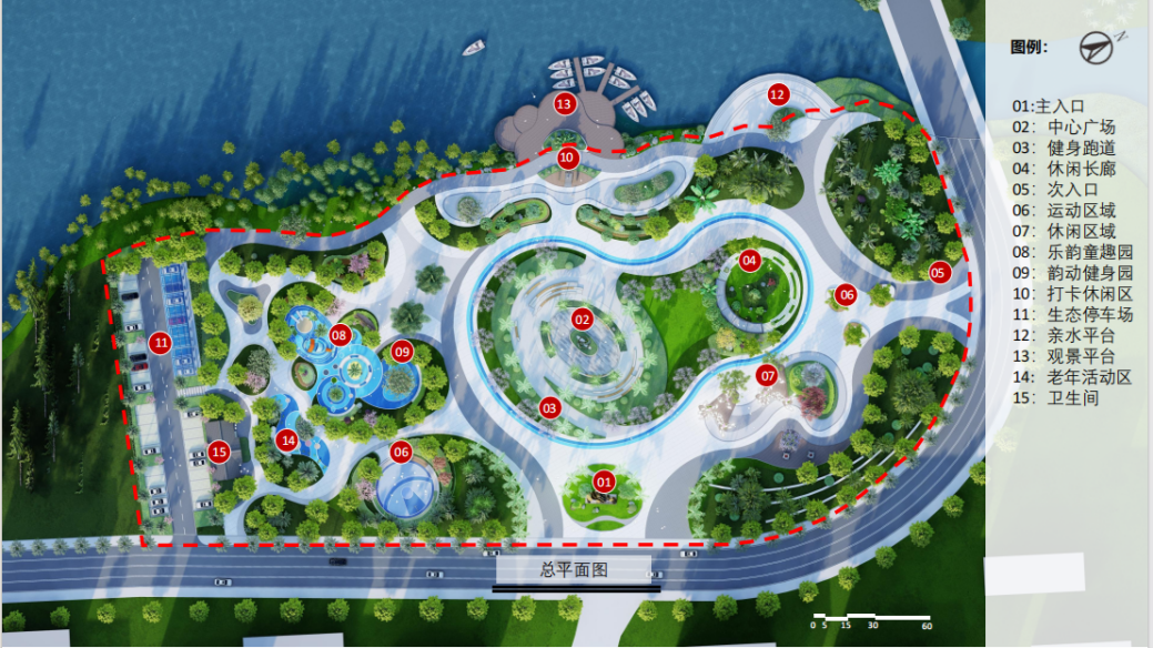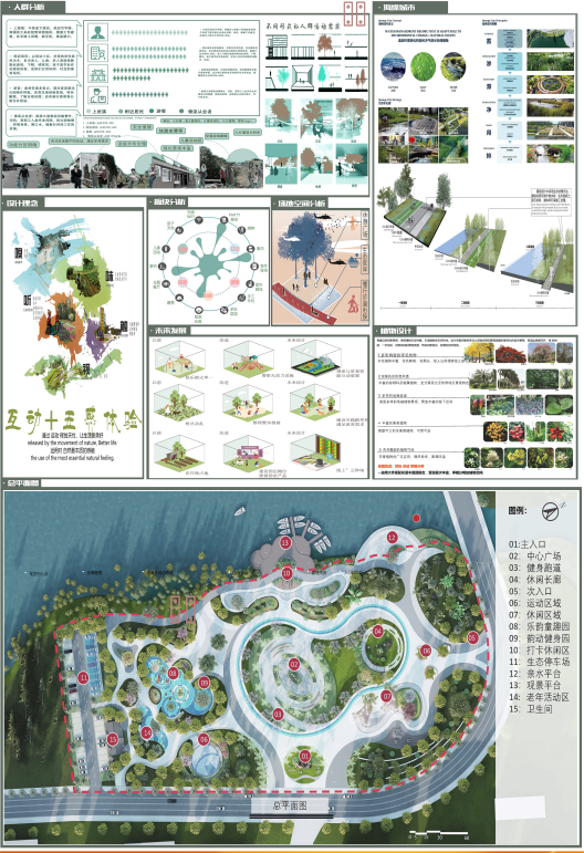 面对老城区公共空间匮乏、设施陈旧等问题,方案提出“一心一轴一环六区”的布局:“一心”即位于公园中心广场景观区域,集中展示当地文化精髓;“一轴”为东西向的文化体验轴,文化体验轴串联各个文化展示节点;“一环”为运动健身跑道环道;“六区”包括入口景观区、亲水平台景观区、休闲娱乐景观区、次入口景观区、全龄健身活动景观区和生态停车场景观区。