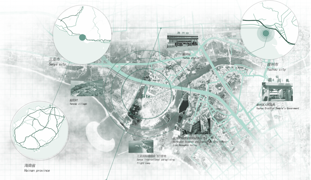 本方案设计,从城市更新的全景视角下对口袋公园的设计方法与策略进行梳理与应用。着眼于崖州老城区这一独特的领域,对口袋公园设计进行了深入的研究。本方案设计选址崖州老城核心区约0.5公顷的边角地块,场地北侧为疏港大道高速公路,场地西侧为三亚崖州中心渔港,场地东侧与南侧为住户棚户区,周边老旧居民区,公共空间极度缺乏。