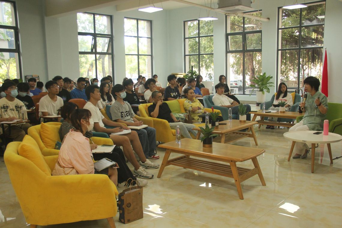 在互动交流环节,环境设计专业的同学们展现出极高的专业热情。大家围绕“如何在毕业设计中体现海南地域特色”、“传统材料与现代环保技术的结合方式”、“文化符号在景观设计中的抽象化表达”等具体问题,与陈教授展开了热烈而深入的探讨。陈教授结合自身研究与设计经验,给予了细致且富有启发性的解答。
