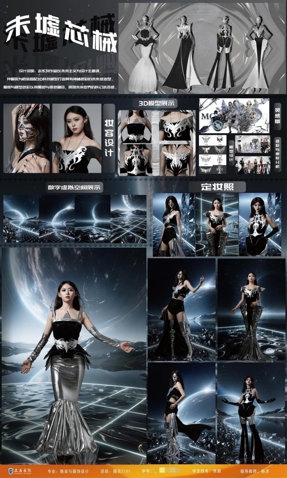 这一板块成为创意碰撞的试验场。学生们大胆创新,将《山海经》元素、黎族纹样与现代设计理念融合,运用创新面料改造手法为我们呈现了具有戏剧张力的服饰造型。同学们还利用 3D 打印技术,打造未来感十足的礼服造型。如以未来主义为主基调的作品《未虚芯械》,设计师通过服装与 3D 科技模型的搭配,结合数字虚拟背景和饰品,展现出未来世界的科幻冰冷感,同时也体现了三亚在国际设计岛探索中的开放与包容精神,彰显了学生们紧跟时代潮流、勇于突破创新的能力。同时通过AI数字人和视频展示为未来设计带来了更多的可能和借鉴。