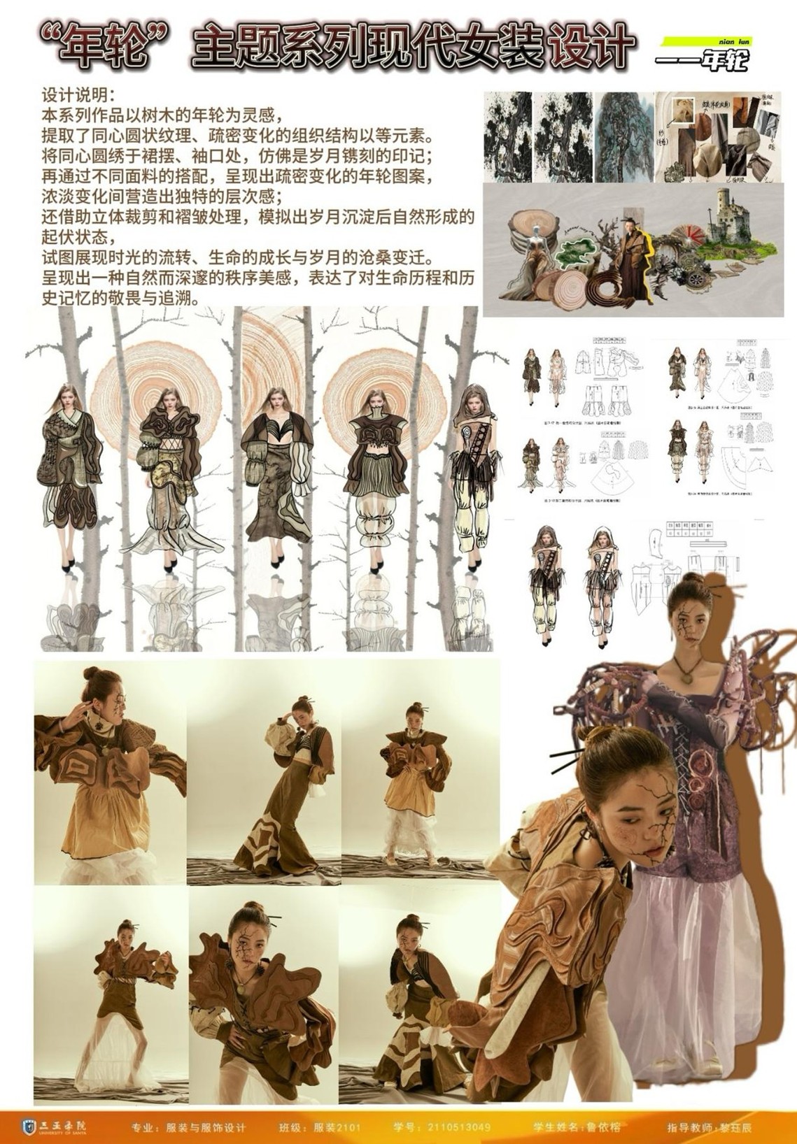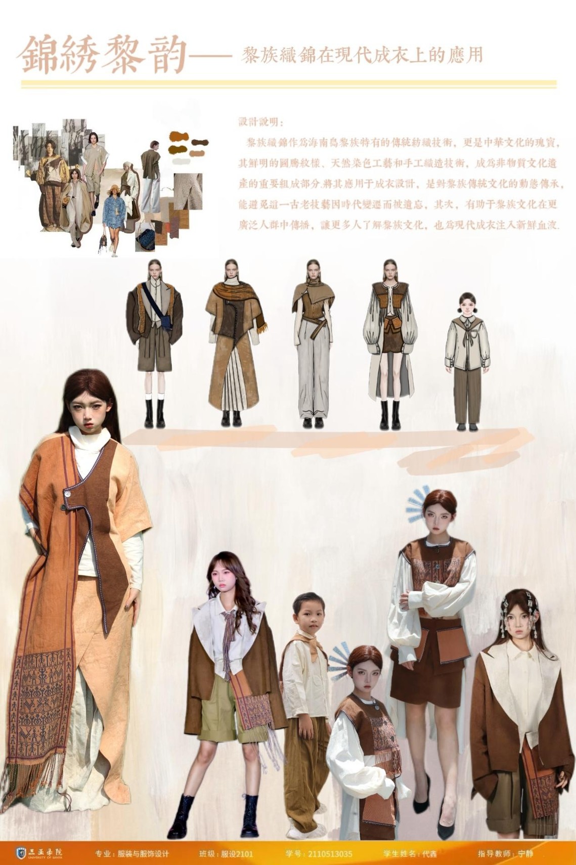 学生们将民族元素结合现代审美进行解构、重组与转化,将厚重历史感幻化为飘逸灵动的当代艺术表达,彰显了年轻一代设计力对文化根脉的守护与活化。在此可看出学生们正肩负起文化传承的使命。他们以当代设计语言为桥梁,积极探索传统工艺、图案、色彩在现代服饰中的再生之道,实现民族文化基因在时尚语境下的创造性转化与创新性发展。