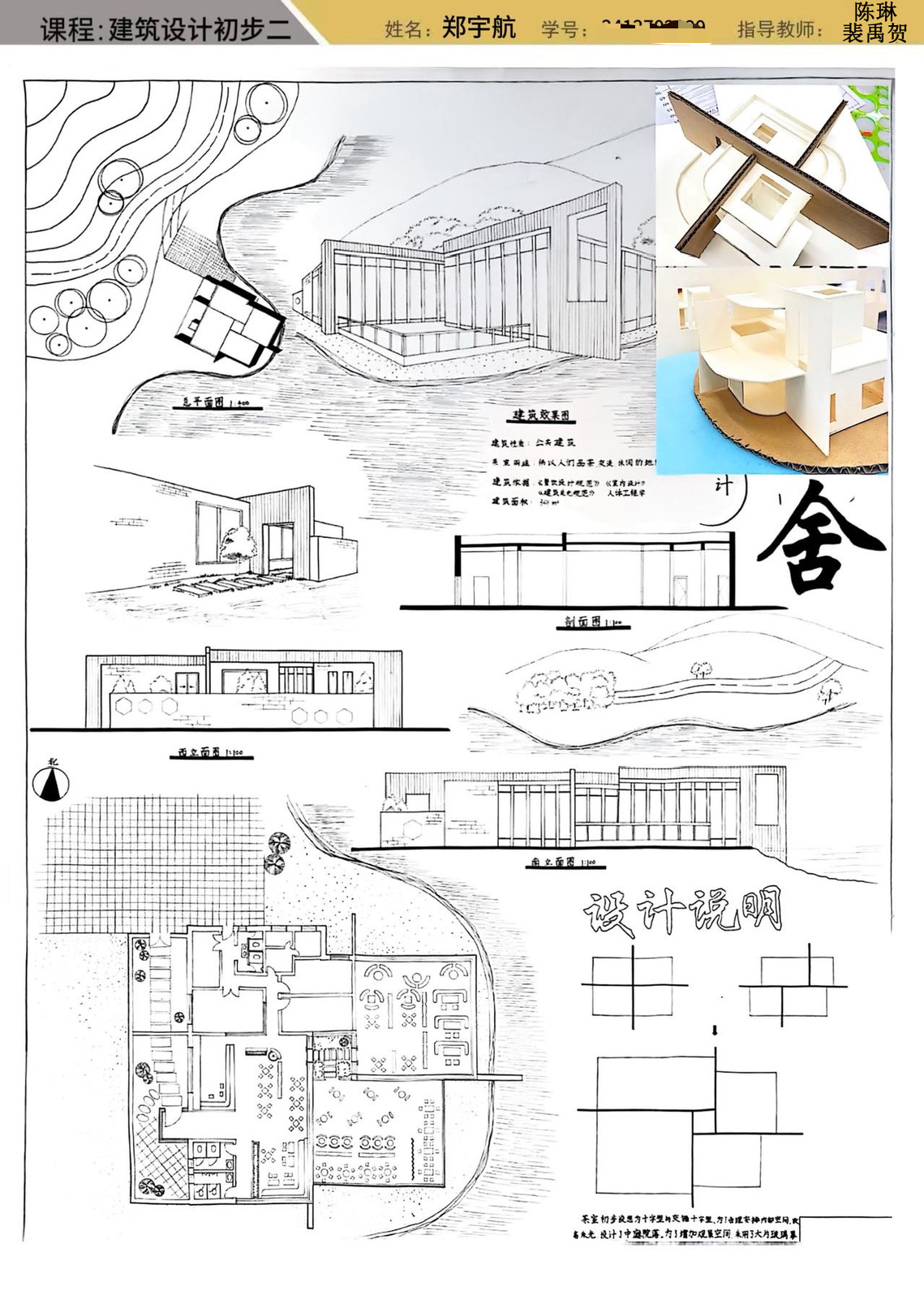 本课程的主讲教师为陈琳、吴耀华、何经、刘屹然、裴禹贺。本学期的《建筑设计初步(二)》在课程内容及授课方式上都进行了调整,课程紧密衔接制图与测绘等前序课程,结合以往分析分析大师优秀案例的训练模式,将注意力转向村民自建房调研学习,此外,本学期加强了理论课的讲解,让同学们能更好地掌握建筑设计的理论、流程,以及模型制作方法等知识。本课程组织学生进行实地考察,并进行实地测绘。同时,强调方案每个阶段中手工模型的制作,尤其强调建筑与场地的比例关系。通过模型制作与图纸比例要求,培养学生对尺度和比例的敏感性。经过一学期的学习,大部分的学生初步了解了建筑设计的方法,能独立的完成小型建筑设计方案。