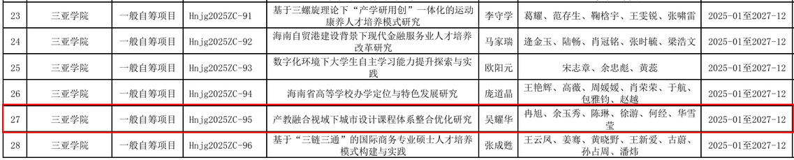 近日,海南省教育厅关于下达2025年度海南省高等学校教育教学改革研究和科学研究项目的通知,吴耀华老师主持的《产教融合视域下城市设计课程体系整合优化研究》(项目编号:Hnjg2025ZC-95)获批立项(图1),标志着城乡规划专业产教融合、校企合作、数字化课程教学改革又取得阶段性成果,在此向城乡规划专业教学团队表示祝贺!