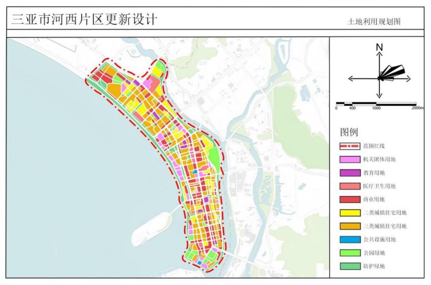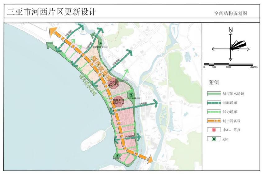 河西片区的空间结构规划为:“一链一带、四区多点、河海通廊”。“一链”指的是沿着三亚湾与三亚河所形成的滨水绿带,“一带”指代半岛服务带,“四区”指南北具有四个不同风貌和主题功能的区域,“河海通廊”是指一系列连接城市内部与沿海区域的绿色景观通道和道路。