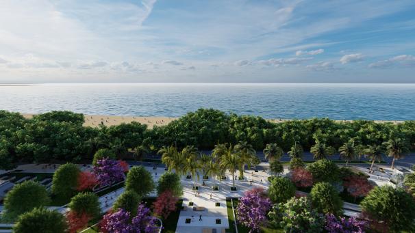 这是明珠广场的渲染意向图,区内种植阔叶林和棕榈树以展示三亚风貌,用简洁大气的建筑更显示出三亚中心区高端商务的特性,明珠广场距离海边仅约500m,周边环境优越。