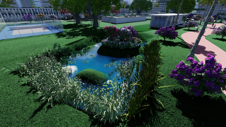 本次设计还运用了海绵城市设计的手法,以期实现雨水的生态循环利用。雨季来临之际,该系统能够高效“蓄水”,储存大量雨水资源,以备不时之需;旱季时,通过巧妙设计“造景”,把储存的雨水用于景观灌溉和生态补水,既美化了城市环境,又实现了水资源的合理调配。这种将生态功能与实用价值完美融合的创新举措,不仅增强了城市应对极端天气的能力,还为推动生态文明建设提供了有力支撑。