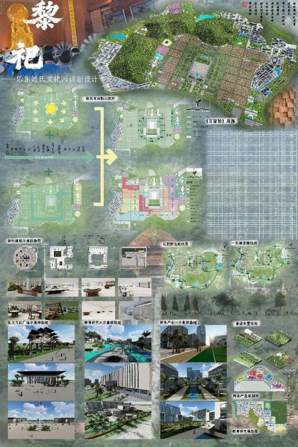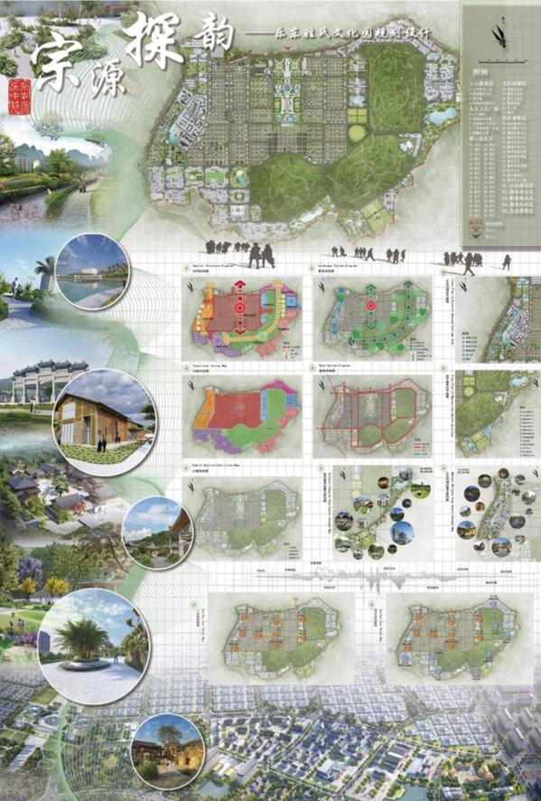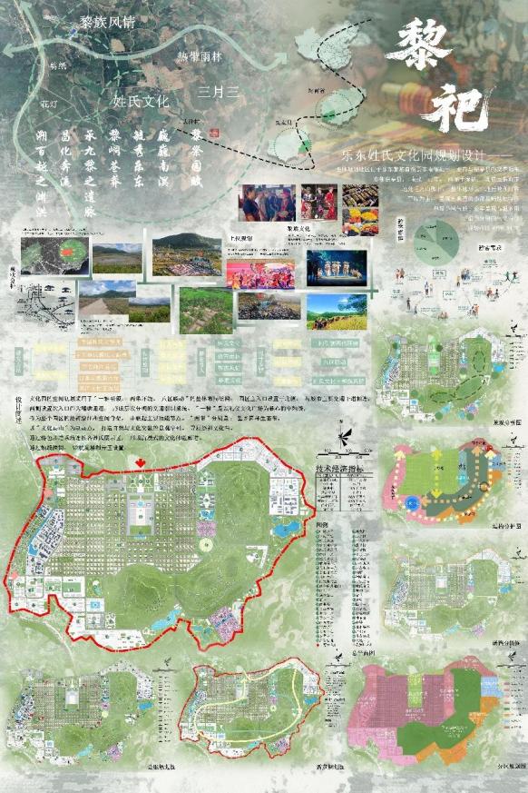 该设计在何经老师指导下,紧扣海南自贸港文旅产业升级需求,聚焦乐东黎族自治县文旅发展实际,以中华姓氏文化为灵魂,巧妙整合当地热带雨林生态资源与黎族非遗文化,构建起 “一轴引领、两带串联、八区联动” 的空间布局。其中,“一轴” 串联起文化展示核心区,“两带” 贯通环山与滨水景观带,“八区” 则涵盖祭祖活动、文化体验、生态观光等多元功能,实现了文化传承、生态保护与旅游体验的有机统一。
