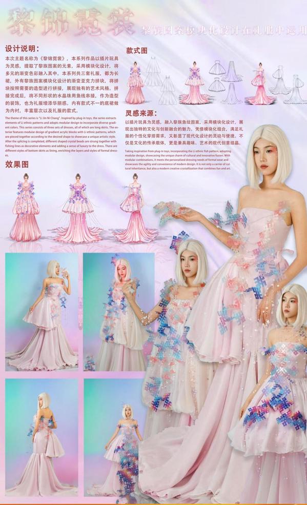 本系列作品以现代礼服为载体,旨在挖掘并焕新黎族传统文化的魅力。设计核心聚焦于黎族经典图案中的鱼纹,对其进行模块化提取与重组。通过模块化设计方法突破了传统纹样应用的局限,在保留黎族鱼纹独特视觉特征与文化内涵的同时,赋予其灵活性与可塑性。设计灵感取自插片玩具的趣味性与构造逻辑。提取后的鱼纹演变为具有多元渐变色彩的可拼插的模块单元。这些模块采用先进的榫卯插接工艺进行组合与连接,附着于礼服的外饰设计中。这种工艺不仅确保了结构的稳固与可拆卸性,核心创新点在于其造型塑造能力,模块能根据设计需求自由组合拼接,创造出丰富多变、极具立体感的轮廓造型,有效强化了基础礼服的廓形并增添了强烈的空间层次与流动线条。