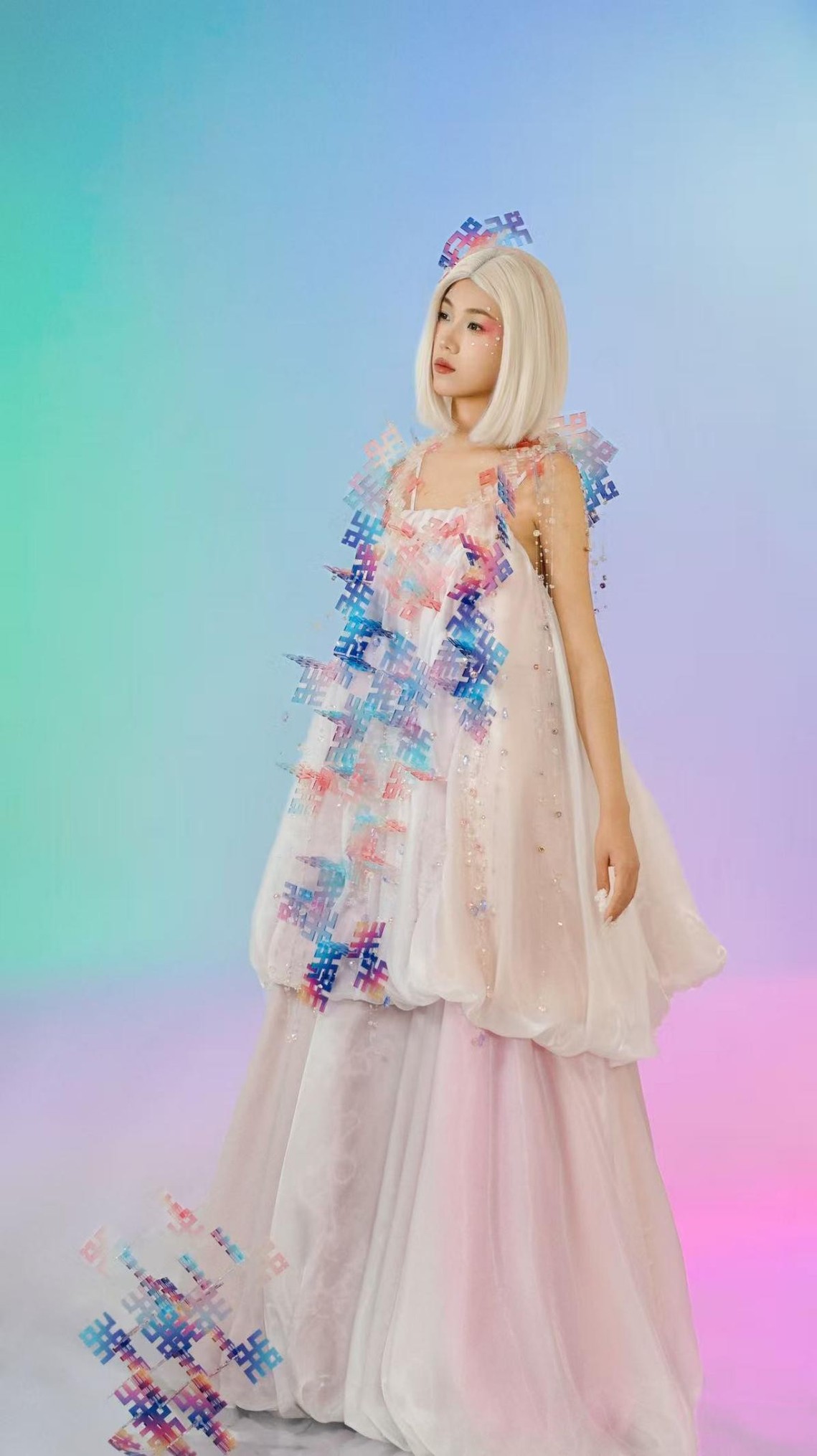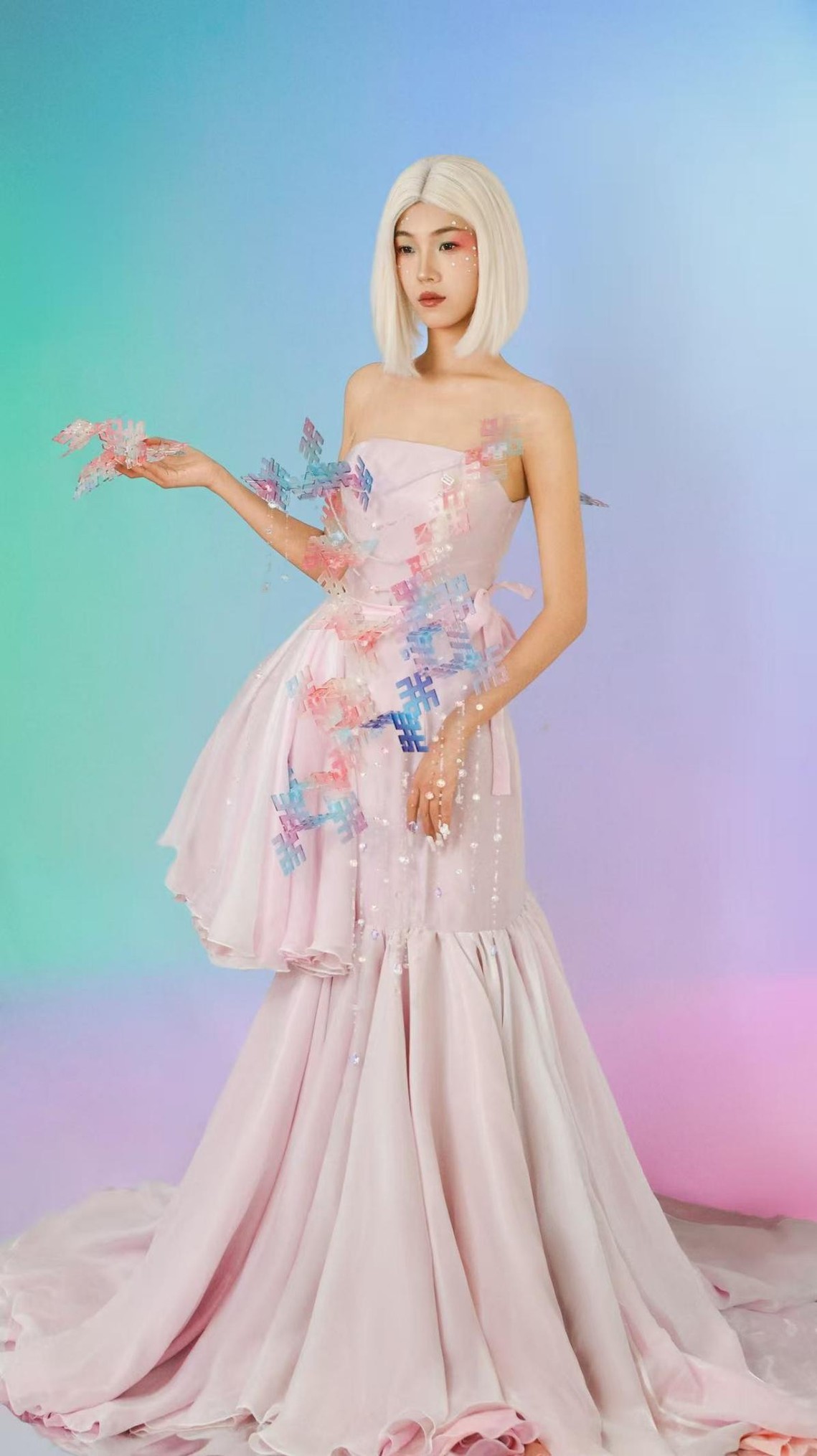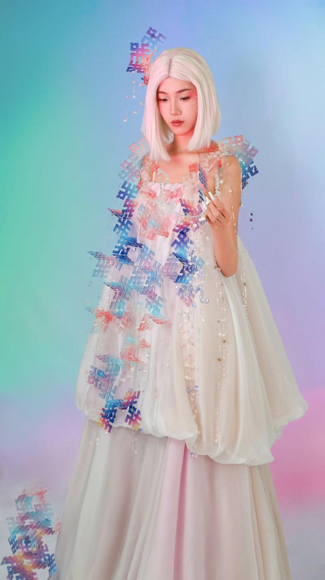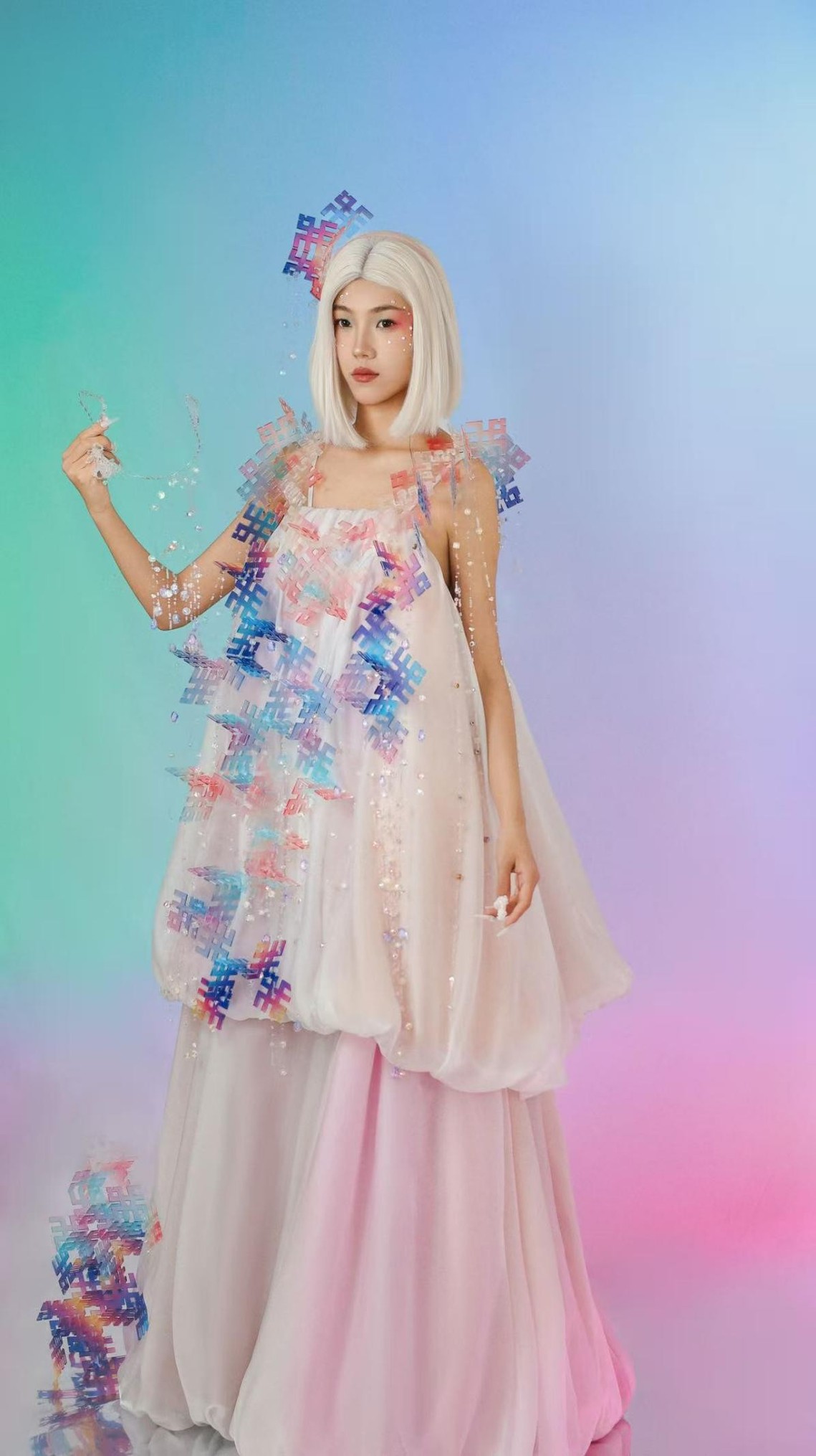 设计呈现:三套礼服展现了虚实相生的层次美学效果,内层采用轻盈垂坠的水柔纱,通过双层裙摆的层叠构造,在行走间形成如流云般的动态韵律。外层装饰突破性运用渐变幻彩的亚克力模块,以对称式设计呈现秩序之美,借均衡式布局诠释灵动之韵。这些未来感材质与几何形态的碰撞,既通过折射光线创造出霓虹流动的科技氛围,又以模块化组合解构传统礼服廓形,在璀璨华丽的视觉张力中,沉淀出大气从容的优雅格调,实现古典美学与先锋设计的精妙平衡。