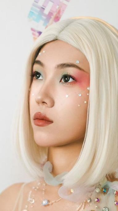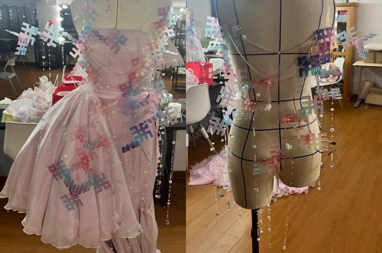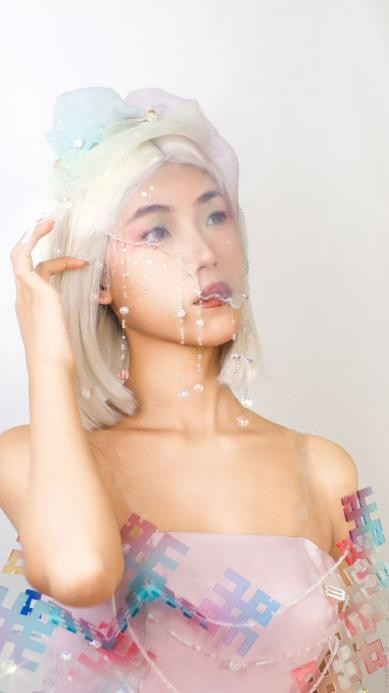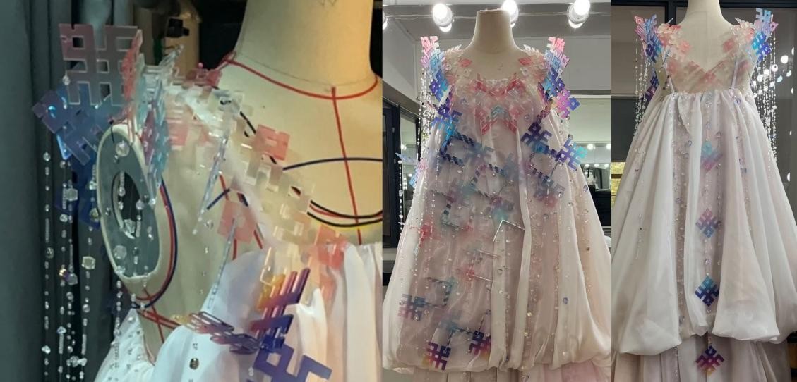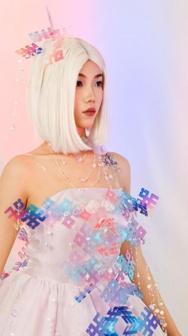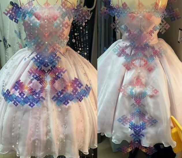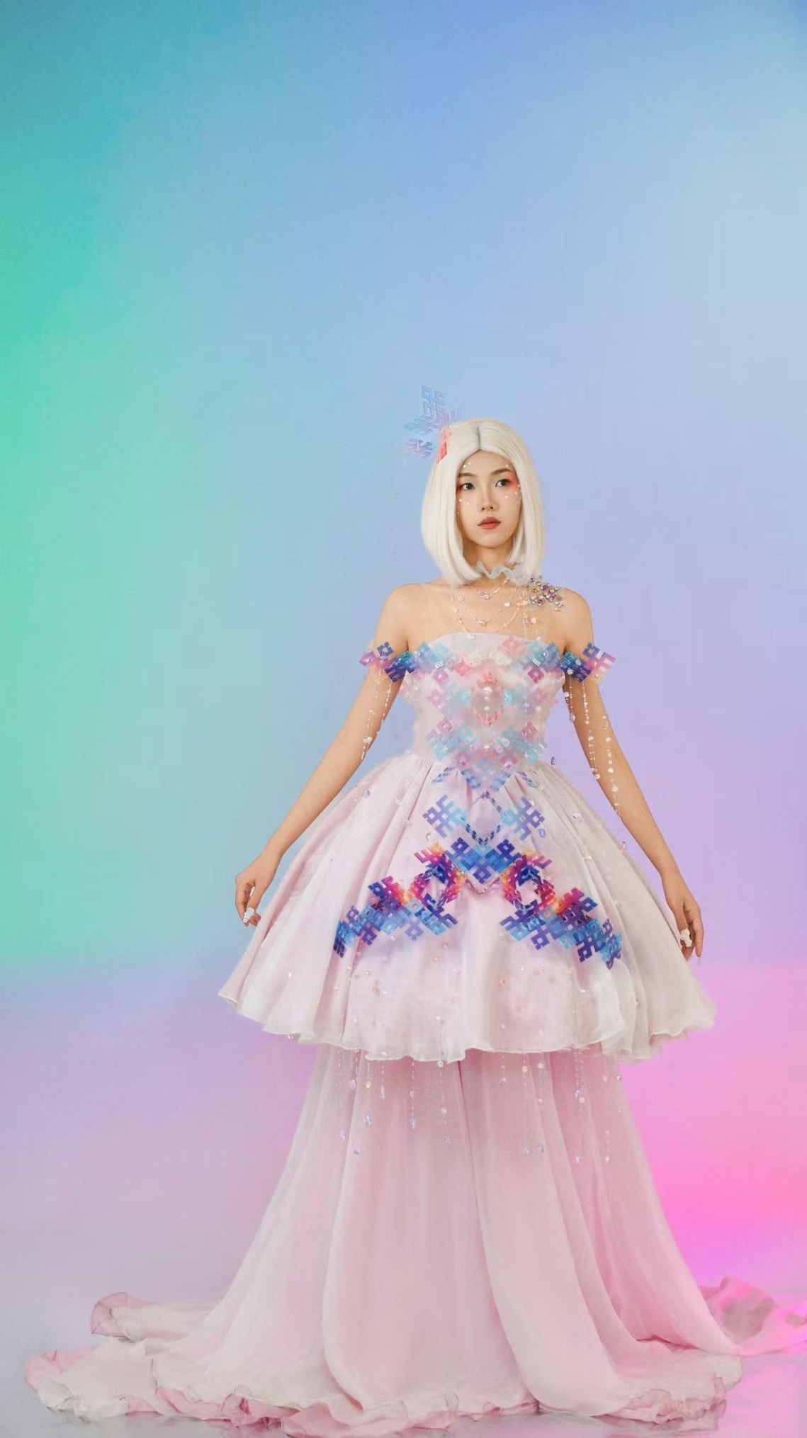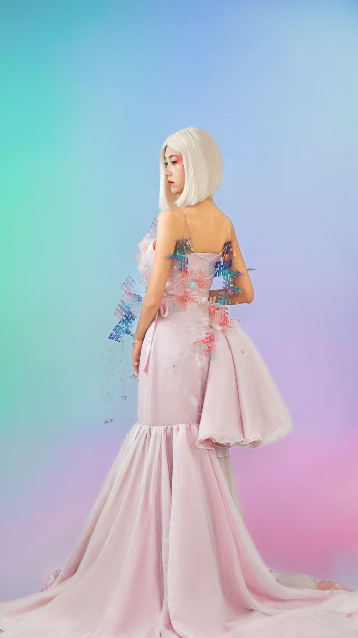 设计呈现:三套礼服展现了虚实相生的层次美学效果,内层采用轻盈垂坠的水柔纱,通过双层裙摆的层叠构造,在行走间形成如流云般的动态韵律。外层装饰突破性运用渐变幻彩的亚克力模块,以对称式设计呈现秩序之美,借均衡式布局诠释灵动之韵。这些未来感材质与几何形态的碰撞,既通过折射光线创造出霓虹流动的科技氛围,又以模块化组合解构传统礼服廓形,在璀璨华丽的视觉张力中,沉淀出大气从容的优雅格调,实现古典美学与先锋设计的精妙平衡。