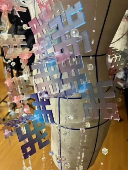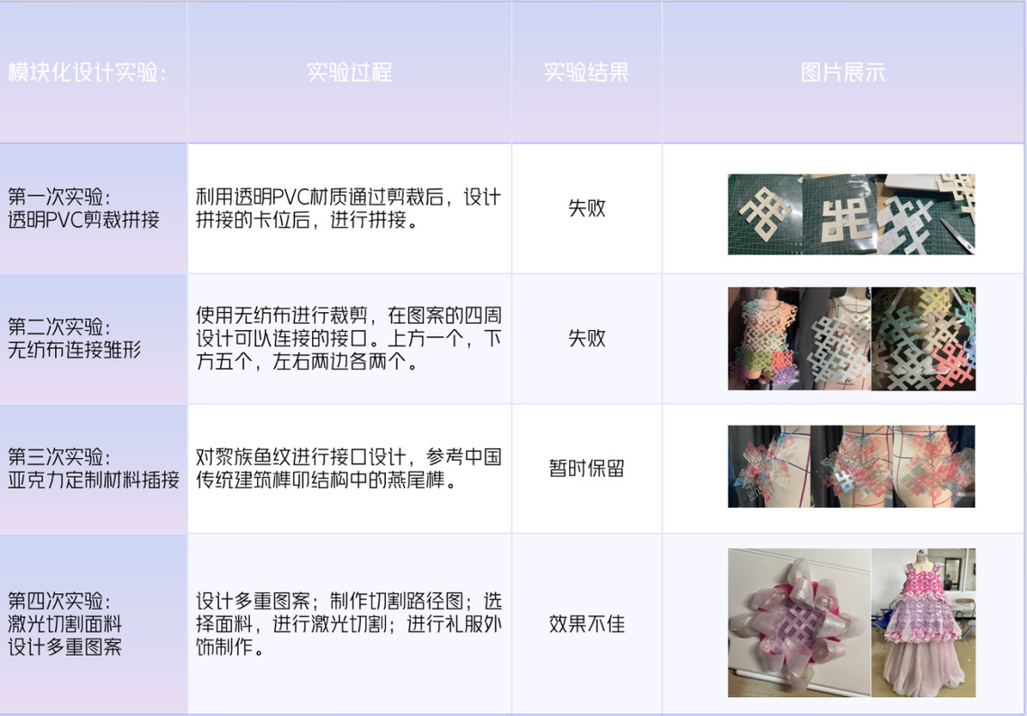 此次设计共进行了四次材料实验,第一次选用PVC材料,后因为PVC材质非常软,厚度达不到,且在制作过程中极易损坏且耗时长。第二次选用无纺布,系列实验后发现面料经过长时间的触摸会变软,无法循环利用。第三次是亚克力材料,制作时参考中国传统建筑榫卯结构中的燕尾榫。利用鱼纹图案的特点,在上下各设计两个接口,插接后造型立体效果较好。第四次用激光切割PVC面料,但切割后因面料接触高温就会发黄变硬,最终放弃了这种方式,改用第三种方式来完成此次设计。
