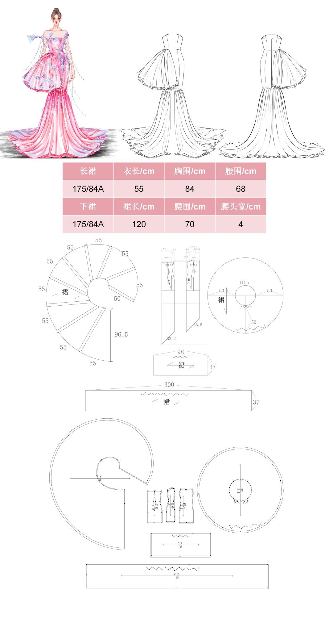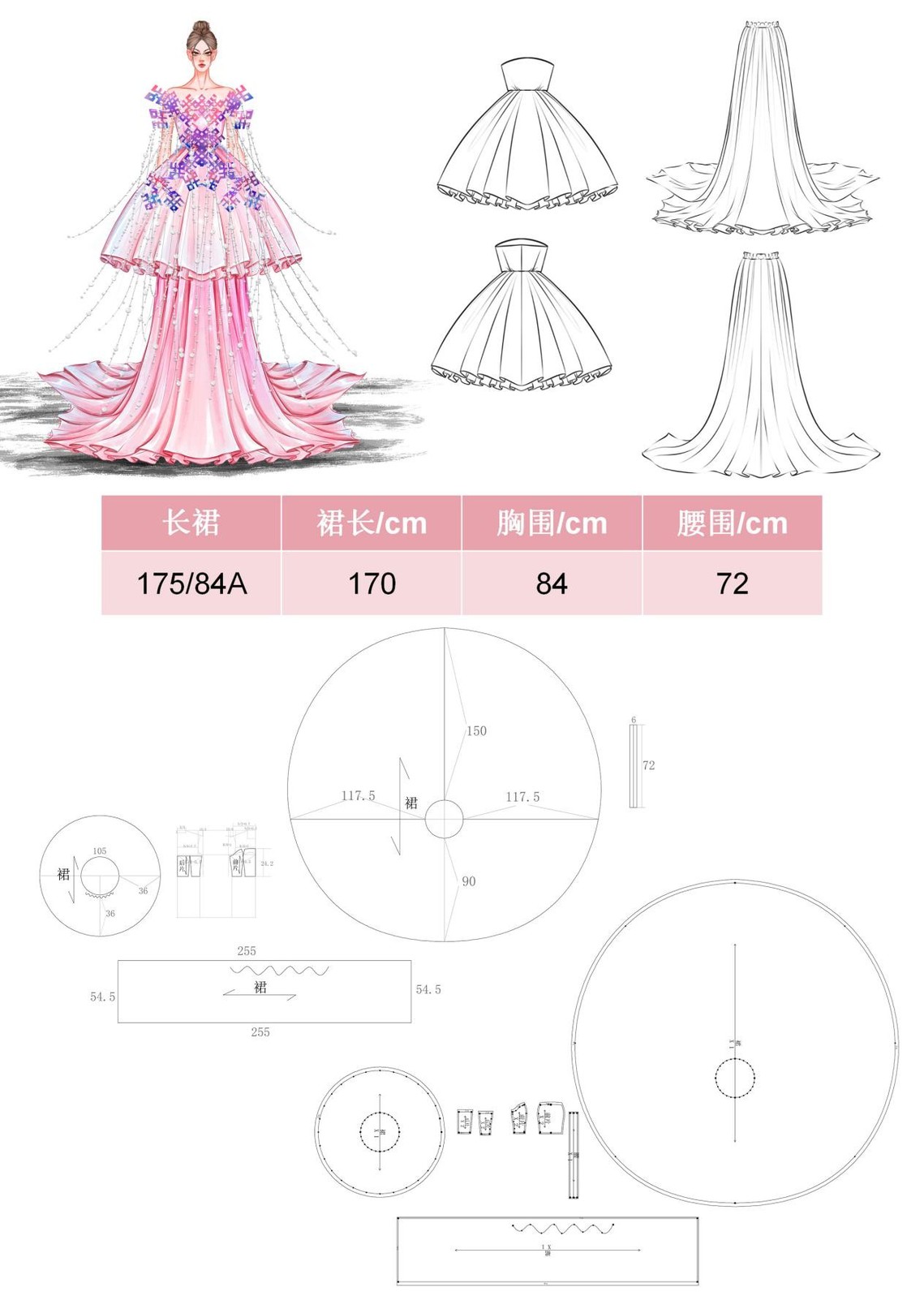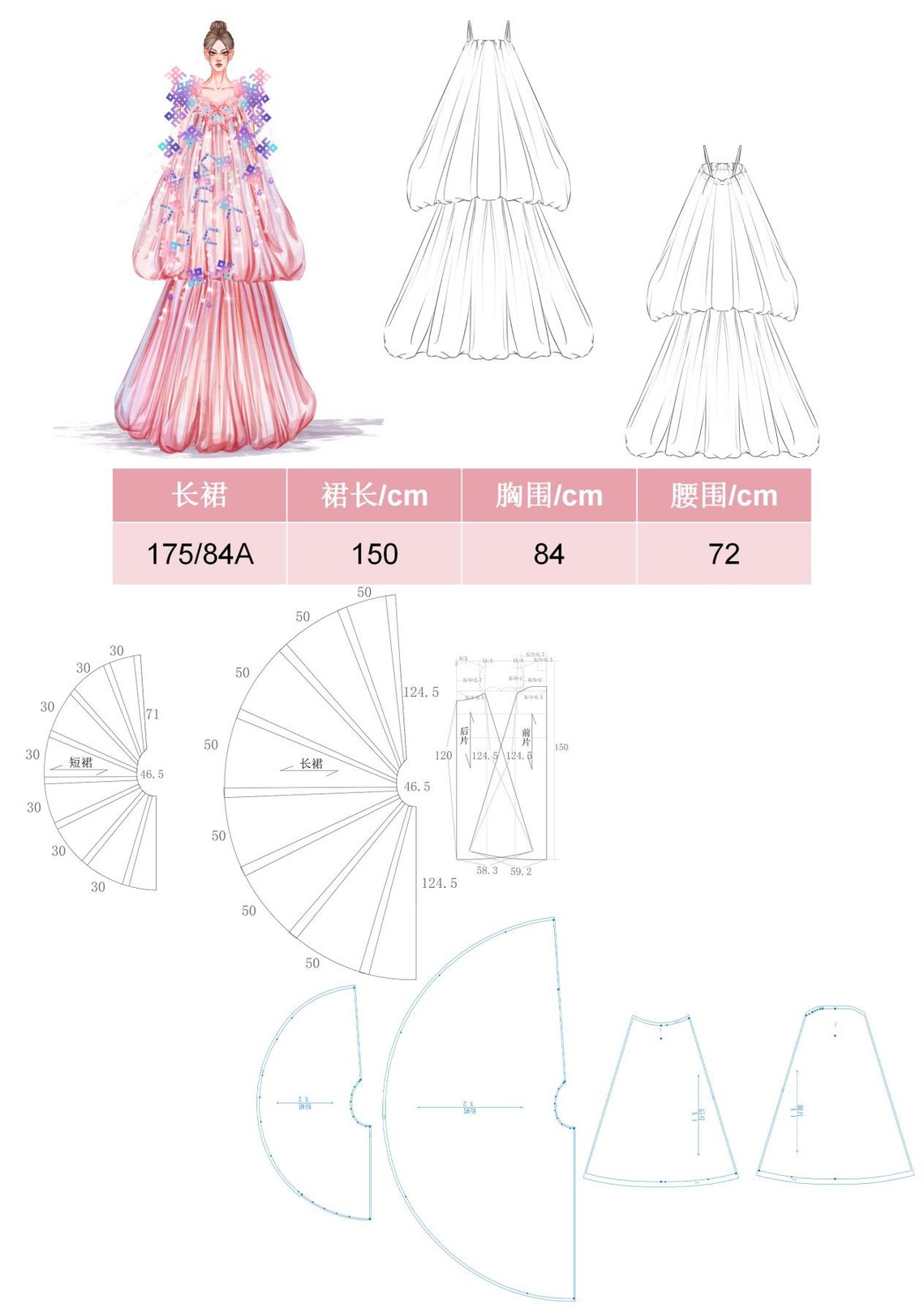 设计实现阶段——绘制款式图及制定裙装规格、绘制打版图、裁片图、采购面料、内裙制作、模块化设计实验、模块化外饰制作、配饰制作、展现成衣最终效果、