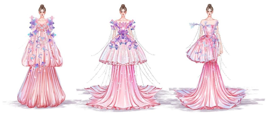本系列设计不仅是对黎族鱼纹的充满敬意且具创意的现代表达,更致力于探索传统文化在当代语境下的活化路径。其模块化设计思路为现代礼服设计在立体造型构建(特别是外饰部分)和材料组合创新方面提供了新的实践方向。最终成果旨在以现代设计语言展现黎族文化的独特魅力,推动其在新时代的传承与发展,并为礼服设计领域注入源于民族智慧的新鲜灵感。