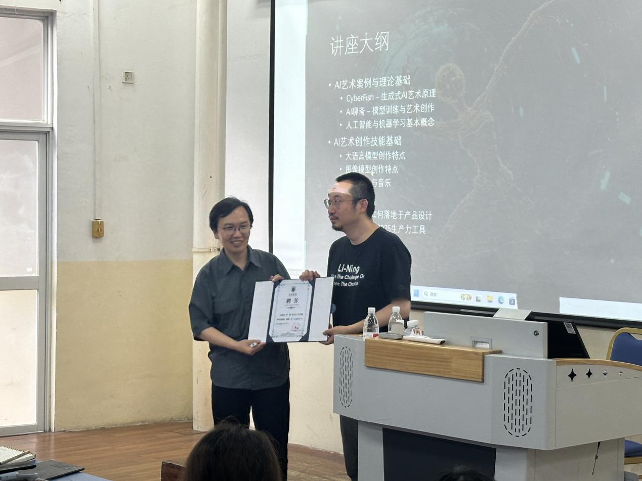 6月19日,技术总监罗霄带来题为《生成式AI艺术原理与创作过程》的实践分享。他结合企业真实项目案例,深入讲解了AI绘画的生成逻辑、模型训练机制与跨媒体创作流程,现场演示多种AI艺术风格的生成路径及操作方法,引发学生对于“人机共创”的热烈讨论。该课程不仅强化了学生对于前沿技术的理解,也拓宽了未来职业发展的多维路径。