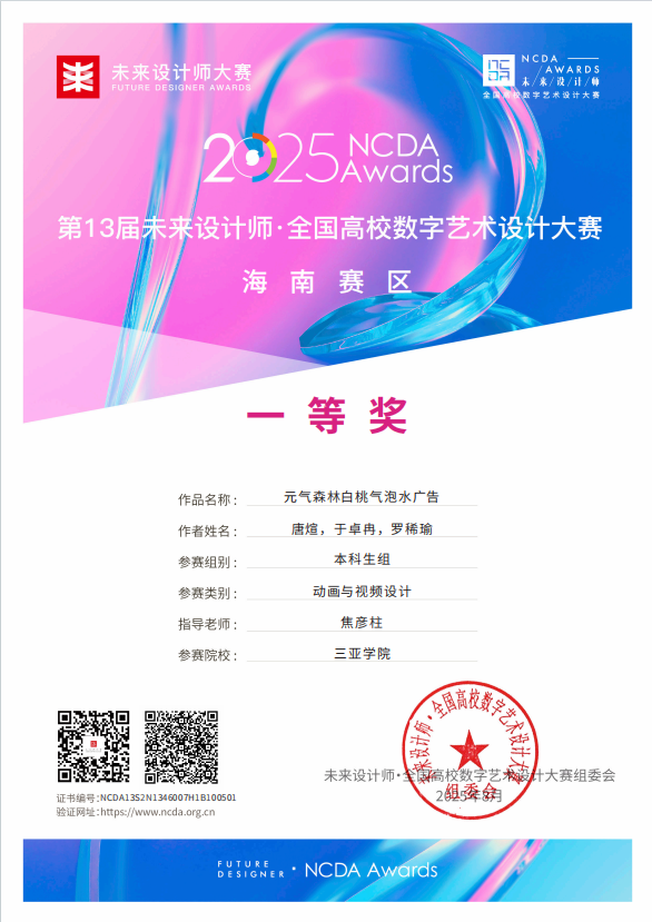 在2025年未来设计师·全国高校数字艺术设计大赛(NCDA)海南赛区评选中,三亚学院数字媒体艺术专业学子表现优异,共斩获一等奖1项、二等奖1项、三等奖3项。其中由唐煊、于卓冉、罗稀瑜团队创作的《元气森林白桃气泡水广告》以海南赛区一等奖的成绩晋级全国总决赛,王艺涵同学创作的《节气之 大寒北韵 雨水南语》 以海南赛区二等奖的成绩晋级全国总决赛,充分展现了学校产教融合的教学成果。