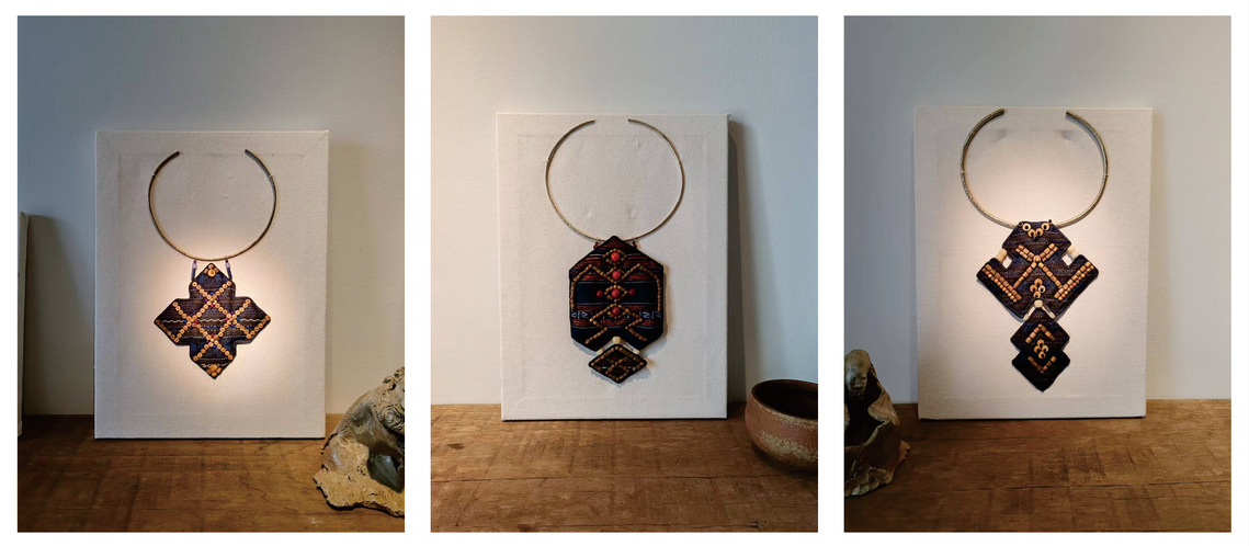 步入展览现场,浓厚的文化氛围扑面而来。兰华丽老师的沉香文创饰品,以传统织物为基底,精心挑选沉香木珠、温润玛瑙等材质,通过巧妙设计与细腻工艺,将非遗技艺的灵魂注入现代饰品。独特造型里,有传统图案的传承,几何轮廓间,是创新设计的突破,每一件作品都似在诉说一场跨越时空的“香遇”——古老非遗与当代生活的相遇、自然香韵与人文创意的相遇。参观者穿梭于展品间,或驻足端详饰品上精致的纹理,感受织物经纬里的岁月沉淀;或轻嗅若有若无的沉香气息,体悟自然馈赠的宁静。