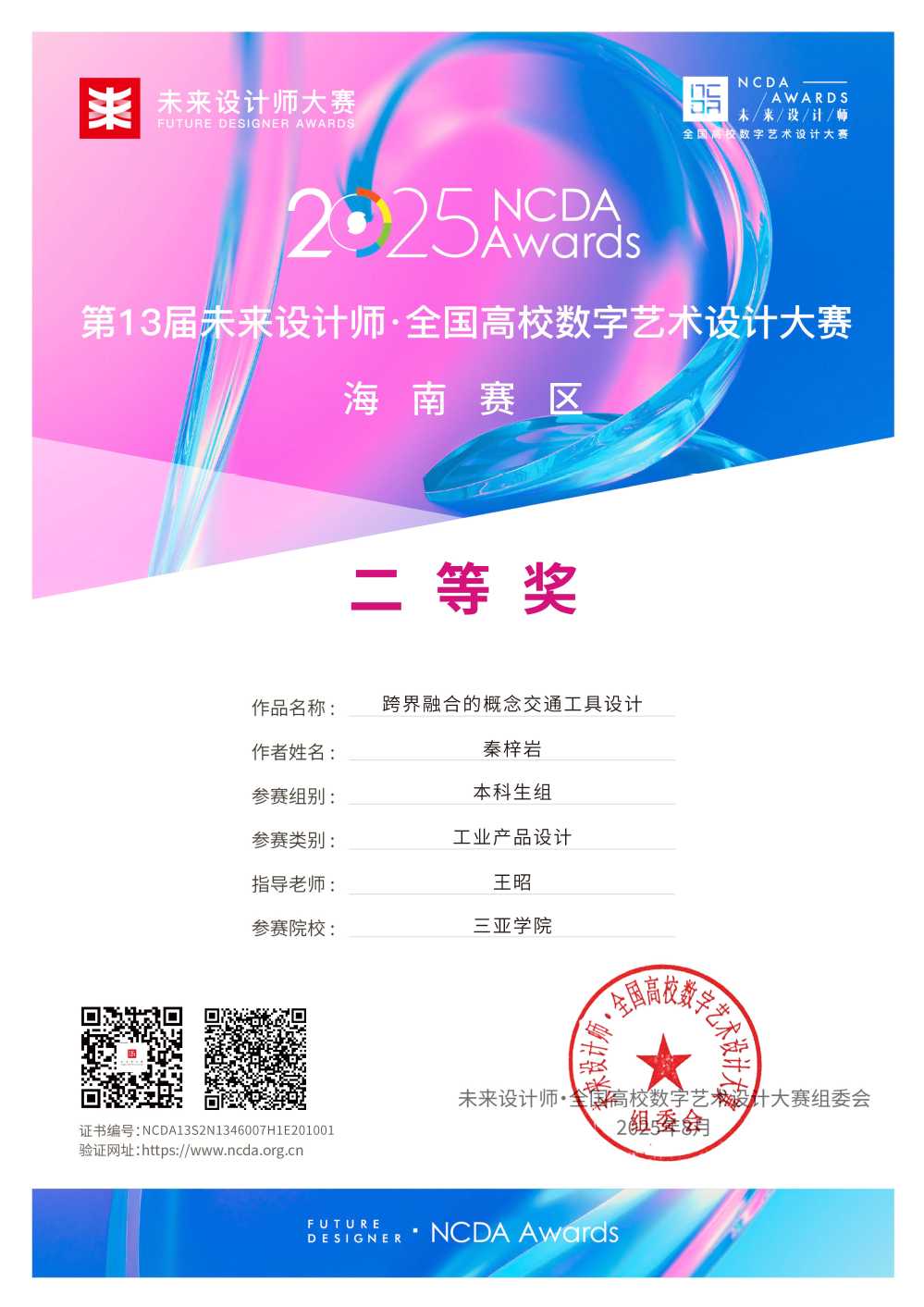 在2025年未来设计师·全国高校数字艺术设计大赛(NCDA)海南赛区评选中,三亚学院产品设计专业学子表现优异,据悉本次NCDA大赛吸引全国1876所高校参赛,我校产品设计专业学生共斩获一等奖1项、二等奖1项、其中由丁思媛、郭力嘉团队创作的《天涯海角·素浪丹砂定海炉》以海南赛区一等奖的成绩晋级全国总决赛,秦梓岩同学创作的《跨界融合的概念交通工具设计》以海南赛区二等奖的成绩晋级全国总决赛,充分展现了我校产品设计专业方向中“地域文化创意设计”和“吉利汽车前瞻设计”两大方向的产教融合的教学成果。