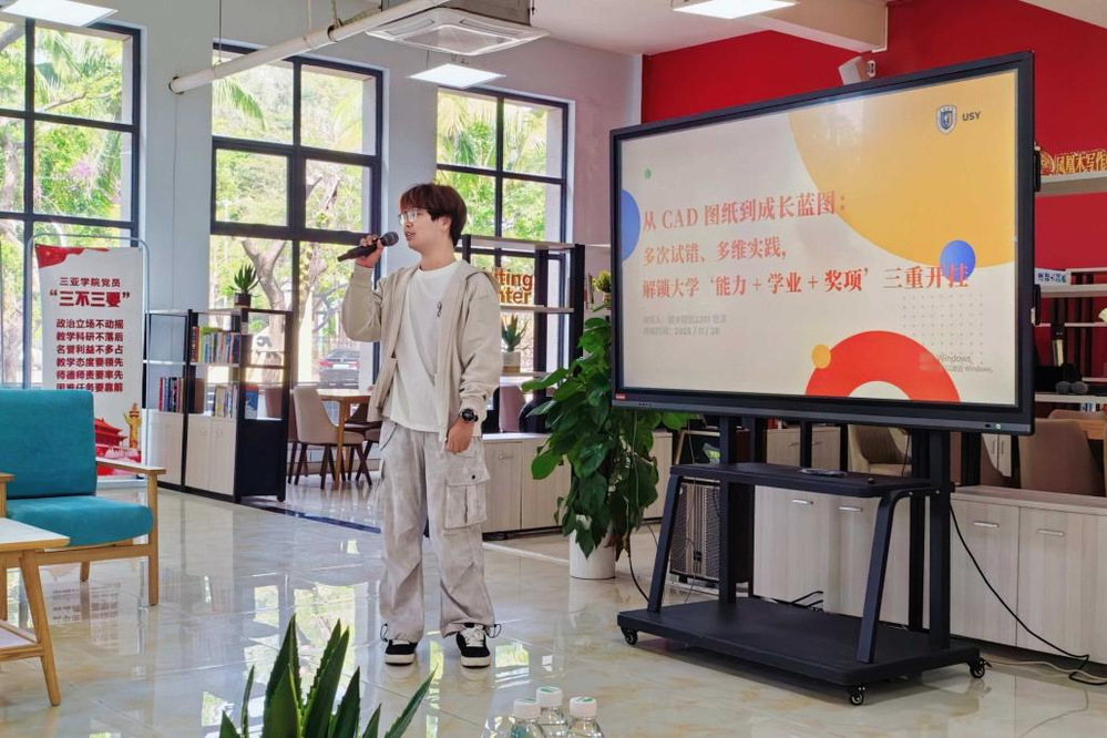 同时,实践项目是锤炼硬技能的最佳平台。曾淳在工作室参与的保亭御泉山雅园施工图制图、三亚学院青春纪念馆模型建构等多个项目,不仅让他熟练掌握了CAD、SU、Lumion等专业软件,还自学了PR视频剪辑,实现了学生工作与专业实践的双向赋能。他提醒大二学子,每个阶段聚焦1-2件核心事,切忌贪多求全,深耕一处才能有所收获。
