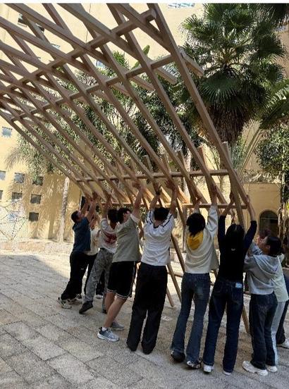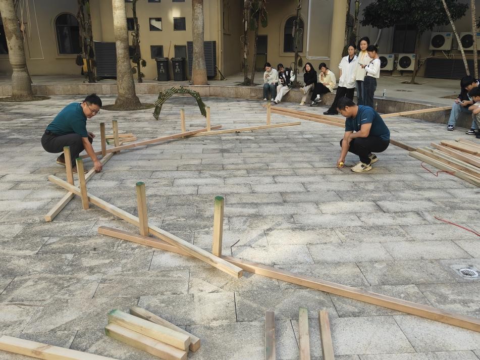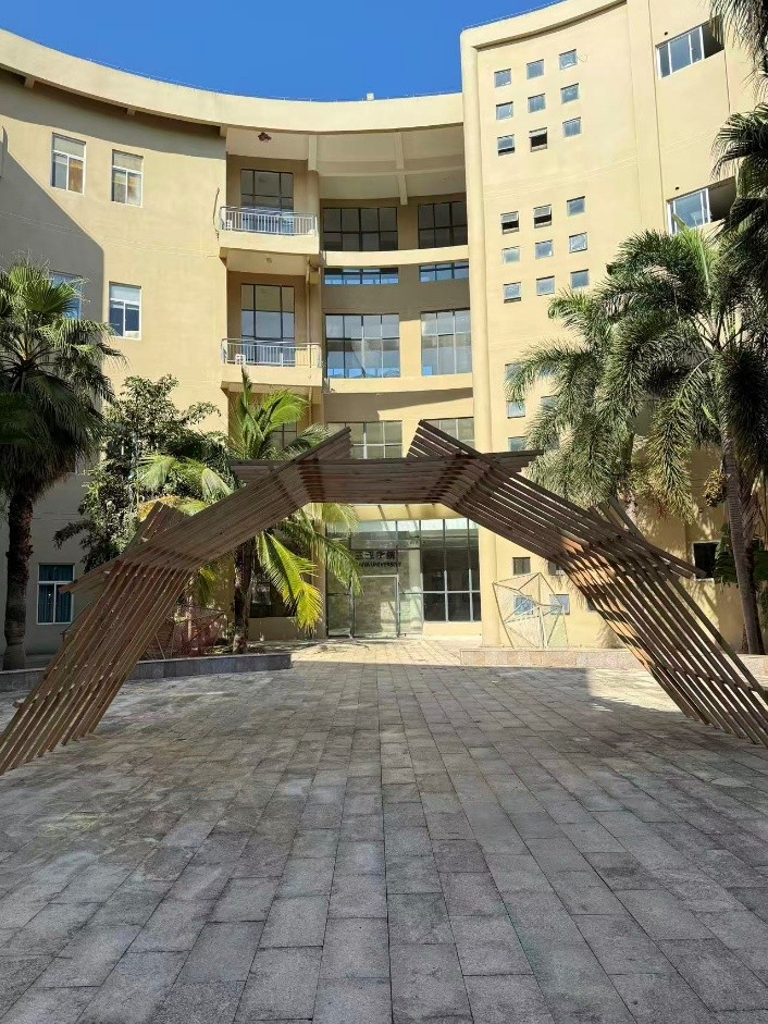 在三亚学院校园内,一座由艺术学院学生团队和老师们亲手设计并搭建的木结构虹桥顺利落成,这是我院研讨模块《跨维与造型(二)》的阶段性教学成果。该作品不仅是力学与美学的结合体,更是团队协作与实践精神的生动写照,见证了师生携手,化朽木为奇景的创作历程。