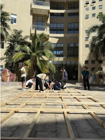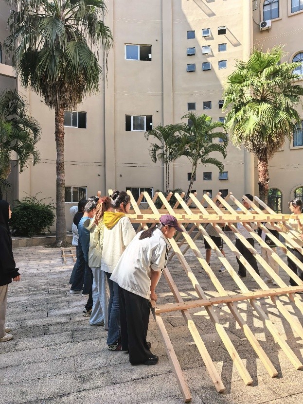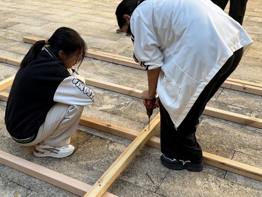 有了模型的指引,真正的挑战在于如何用真实的木材料将其等比放大。同学们面对的是一堆堆原始的木条,第一步便是繁复而至关重要的测量。卷尺,标记笔成为他们最亲密的伙伴。团队成员们需要反复测量、比对每一根木头的木条的大小,确保尺寸分毫不差。“失之毫厘,缪以千里”,在这个环节得到了最真实的体现。大家深刻体会到,艺术创作不仅需要天马行空的想象,更需要脚踏实地的严谨。