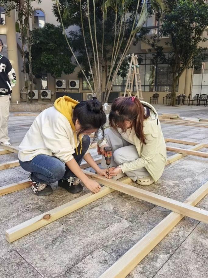 本次作品的核心工艺,在于使用了高性能的电钻作为唯一的连接工具。与传统工艺需要先打孔,再固定的繁琐步骤不同,无需预钉孔,即可凭借电钻的强大旋转,直接将其精准、高速地“钻”入坚硬的木料之中,瞬间完成木条与木条之间的连接。现场,电钻的轰鸣声如同一曲激昂的乐章,见证了建筑的骨架的成型。这一过程,不仅让同学们熟练掌握了现代电动工具,更让他们感受到了科技为创作带来的高效与精准。