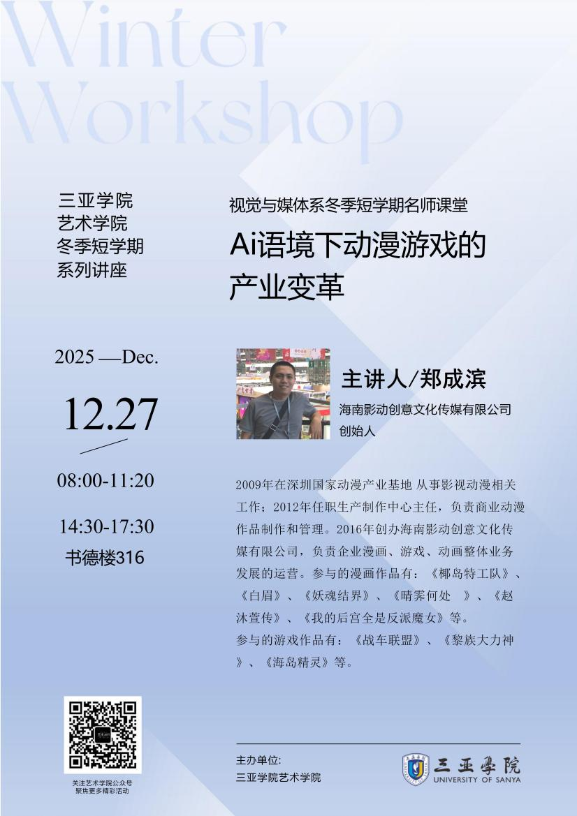 暖冬启智,艺韵生辉!三亚学院艺术学院冬季短学期名师讲座季热力开启,我们特邀建筑设计、视觉空间设计、动漫游戏设计、乡土民居研究等多领域行业大咖与学术专家齐聚校园,带来一场场兼具深度与广度的知识盛宴。