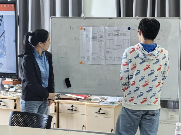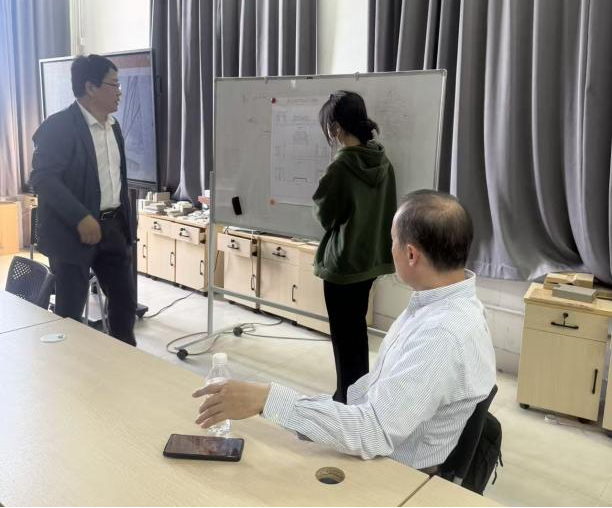 系主任吴耀华老师在发言中简洁点明了基础实践的重要性:“城乡规划专业离不开扎实的实操功底,今天大家展示的制图、测绘成果,就是专业成长的第一步。希望同学们珍惜入门阶段的学习机会,把基础打牢,为后续学习做好铺垫。” 专业主任徐游老师结合模块内容,梳理了基础学习与后续专业成长的关联:“建筑制图、测绘这些看似简单的实操,是未来学习城市设计、规划调研等内容的基本功。现在把这些基础练扎实,后续才能更好地衔接高阶专业内容。” 资深教师单冰茸老师和何经老师则从实践学习方法上给出建议:“入门阶段不用急于求成,先把基础规范、基础工具用法学透。”“这里漏画了窗户。就像这次的制图练习,除了把线条、比例这些基础要素掌握好,如果能够结合三亚地方特质进行为什么这么设计的进一步思考就更有进步。”