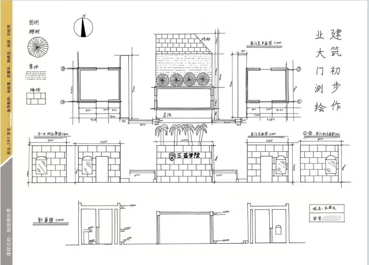 课程共15学时、8个教学周,采用“理论讲授-示范模仿-实操研讨-成果复盘”的螺旋式教学法,循序渐进地引导学生从理论认知走向实践应用。教学初期,通过案例研讨引发学生思考“何为建筑测绘”“不同专业看待建筑的差异”等核心问题,帮助学生建立专业认知;中期聚焦平面图、立面图、剖面图及轴测图的测绘与表达,以三亚学院南门为实景测绘对象,涵盖门卫室、花坛、人行道、车行道等全要素测量;后期通过小组互审、教师评图等方式复盘成果,解决共性问题。