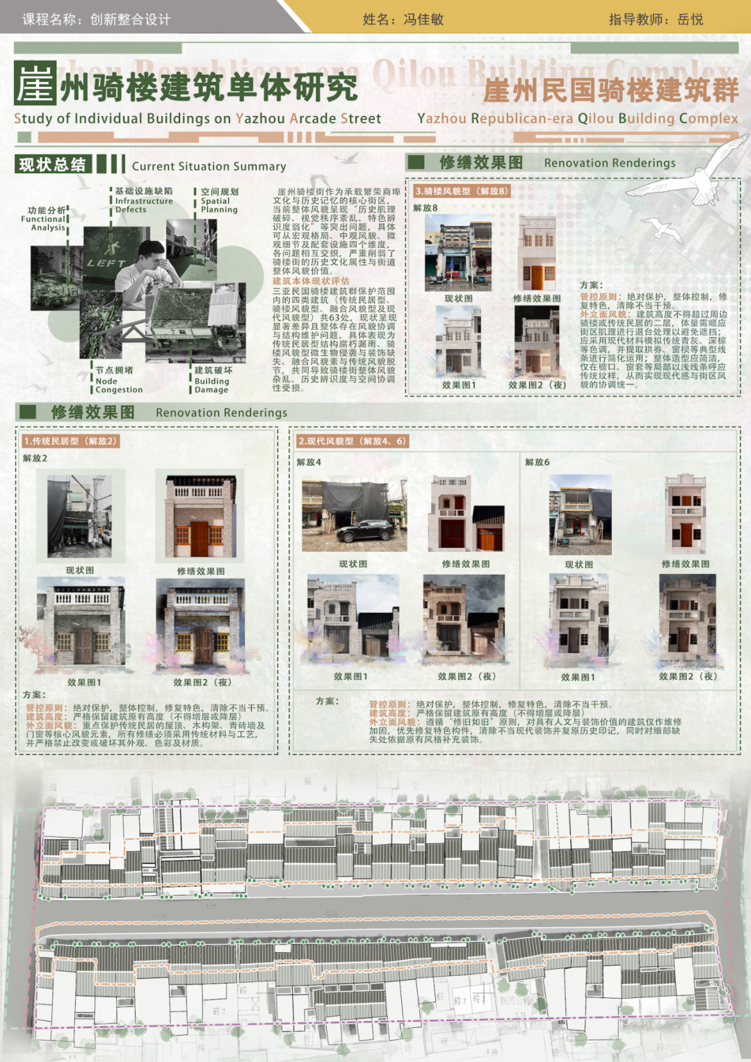 为让项目制教学的设计成果更具落地性,课程团队对接当地旅文局,获取了崖州古城的详细图纸与63户居民的基础信息。学生们的设计任务,直指骑楼街区外立面风貌杂乱、功能业态混杂的核心痛点,真正做到真题真做、学以致用。