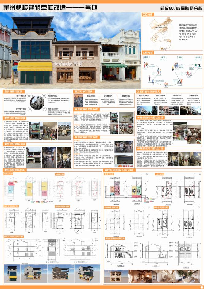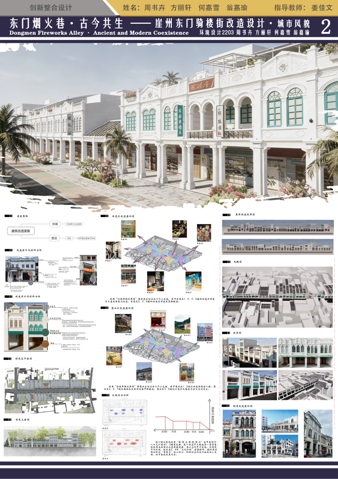 该同学主要为建筑单体设计研究,从前期的调研到后期的设计深化都做了深入的研究,紧扣海南崖州骑楼的历史脉络,梳理骑楼建筑的南洋风格与本土民俗特征,在改造设计中保留骑楼立面雕花、骑廊空间等标志性元素,同时结合当代使用需求优化功能,实现文化遗产保护与活化利用的结合。