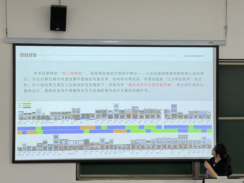 “我们希望学生在项目制课程中读懂建筑文化遗产的价值,掌握‘修旧如故’的保护原则,精准识别崖州骑楼的券门、灰塑、南洋风格等特征,借鉴海口骑楼保存、恢复、再生的实践经验。”陈琳教授这样阐释课程目标,“更重要的是,让这个阶段的学生具备独立测绘、访谈调研、问题诊断的能力,能够输出图纸、效果图、设计说明等完整方案。同时,在项目实践中植下文化传承的意识、社区关怀的理念,锤炼团队合作的素养。”