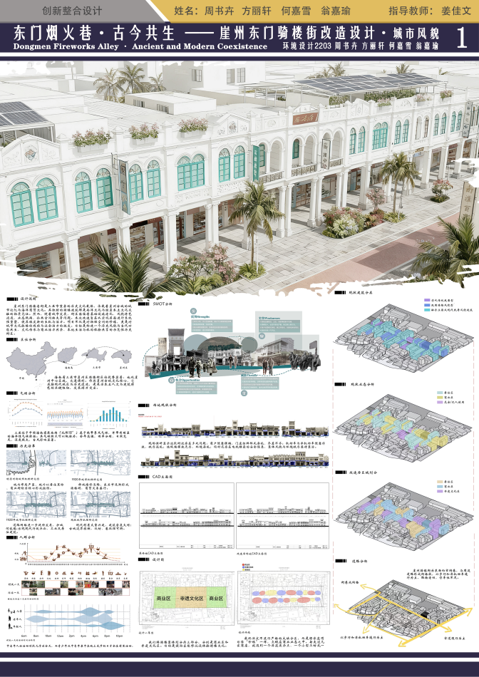 该同学主要为建筑单体设计研究,从前期的调研到后期的设计深化都做了深入的研究,紧扣海南崖州骑楼的历史脉络,梳理骑楼建筑的南洋风格与本土民俗特征,在改造设计中保留骑楼立面雕花、骑廊空间等标志性元素,同时结合当代使用需求优化功能,实现文化遗产保护与活化利用的结合。