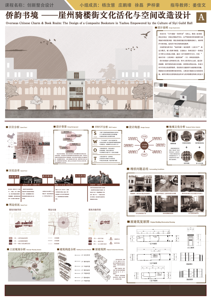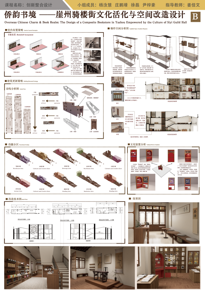 小组4人在本次创新整合设计课程完成比较出色。调研环节扎实深入,能精准捕捉四邑会馆的文化底蕴与现存问题,以 “保护与利用兼顾” 为核心定位,思路清晰且贴合主题。方案在保留岭南骑楼风貌、传统梁架等核心特色基础上,植入复合书吧功能,兼顾文化传承与现代需求;同时规划业态联动与预留接口,兼顾当下落地性与长远发展,展现较强的专业思考。小组深刻领悟历史建筑活化的核心是文化与生活的融合,体现良好的专业素养与文化敬畏心。整体过程兼具挑战与成长,成果亮眼,望继续深耕传统与创新的平衡,精进设计能力。
