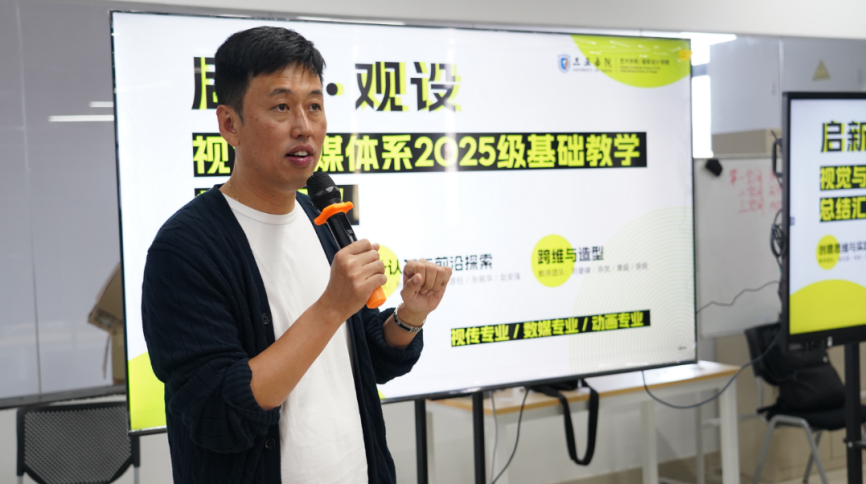 课程汇报结束后,艺术学院&国际设计学院党总支书记、副院长张鑫副教授对本次活动进行总结。他对视觉与媒体系2025级基础教学工作取得的成果给予高度肯定,认为本次汇报全面展现了基础教学的成效与新生的良好精神风貌。张鑫教授指出,基础教学是人才培养的关键环节,希望视觉与媒体系全体教师继续深耕教学,不断优化课程体系,创新教学方法,以更高标准推进教学工作;同时鼓励2025级新生以本次汇报为新起点,继续保持积极的学习态度,深耕设计领域,不断提升专业素养与创新能力,成长为优秀的设计人才。