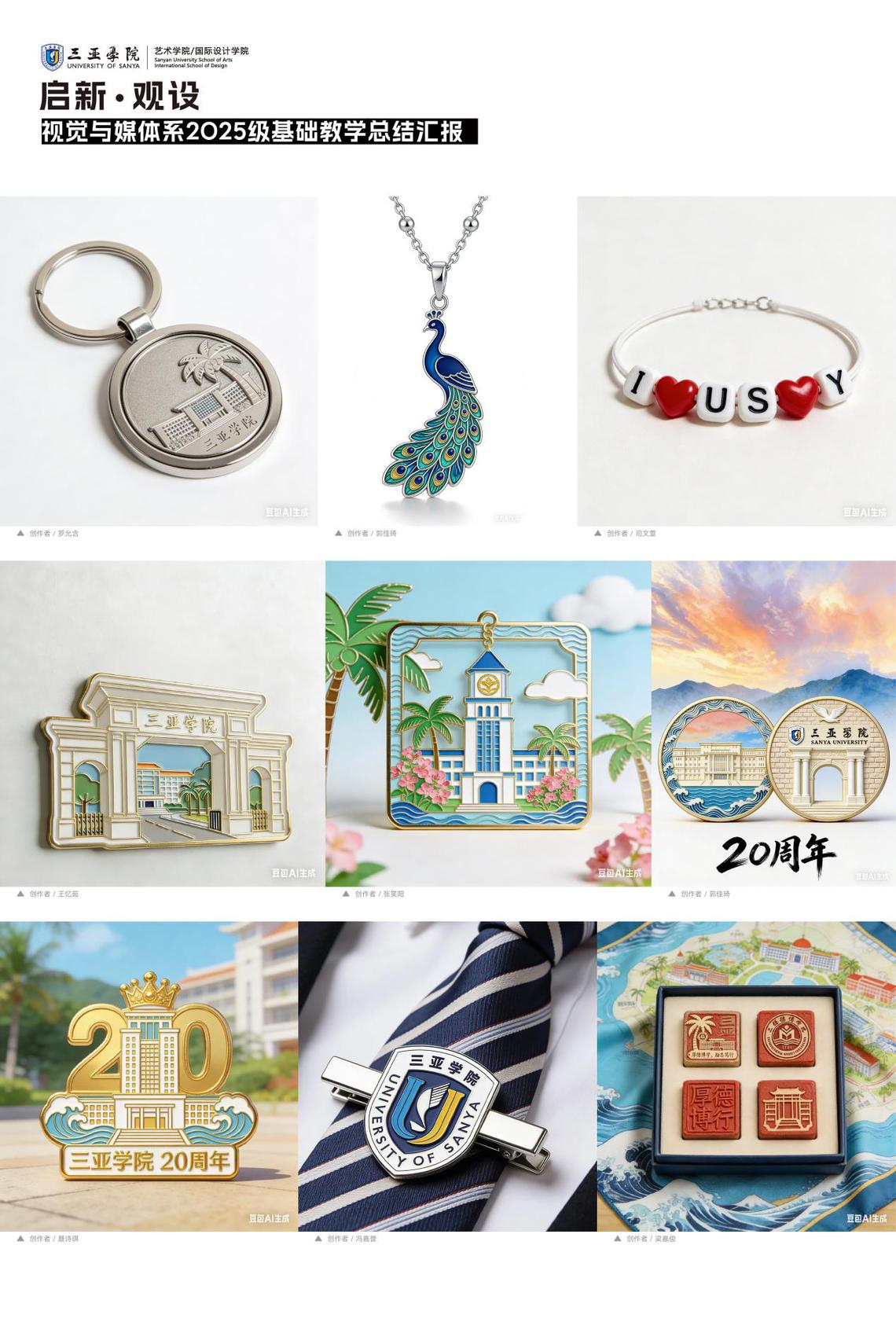 《设计认知与前沿探索》部分,由张鑫、方超、焦彦柱、张振华、赵安强组成的教师团队进行总结。教学重点放在设计思维启发与前沿技术融合上,课程引入AI人工智能工具作为创作媒介,在教师引导下,学生围绕三亚学院校园主题展开不同元素、场景、风格的设计探索。通过前期概念构思与设计逻辑梳理,人工智能被作为辅助工具,用于生成、拓展与重构视觉表达结果。