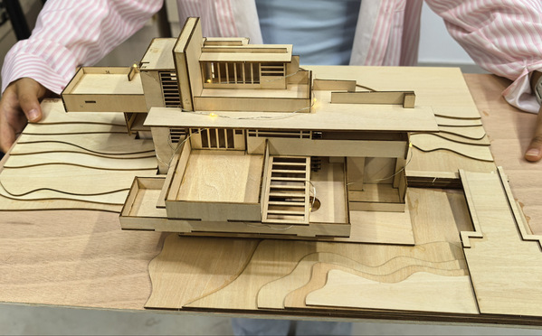 结课展示现场,一件件精致的建筑模型令人眼前一亮,95% 的同学能独立完成 1:100 比例完整建筑模型制作,所有作品均达到结构稳固、比例协调、逻辑清晰的专业标准。切割面平整光滑,拼接处牢固无缝,精准还原了建筑的空间形态与设计细节。在创新表达上,约 30% 的学生展现出突出潜力:有的创新曲面屋顶塑形工艺,让建筑线条更具流畅美感;有的采用亚克力板与木片的混合材质组合,增强了模型的视觉层次感与质感;还有的在空间布局中融入人性化设计思考,让模型不仅是建筑缩影,更传递出设计温度。