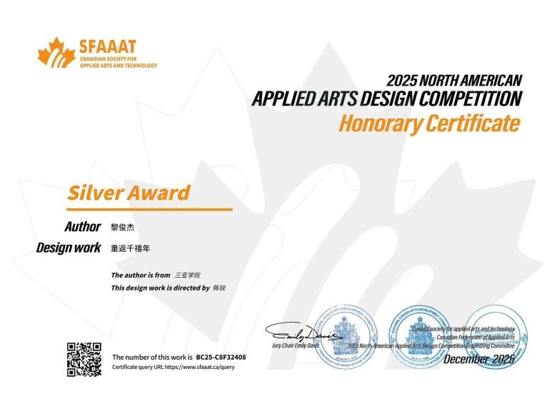 课程改革的卓越成效,在国内外专业竞赛舞台上得到了集中检验。本课程孵化的学生作品在多项权威赛事中屡获佳绩,尤其在2025第二届AADC北美应用艺术设计大赛中表现突出,充分展现了课程的前沿性与国际竞争力。