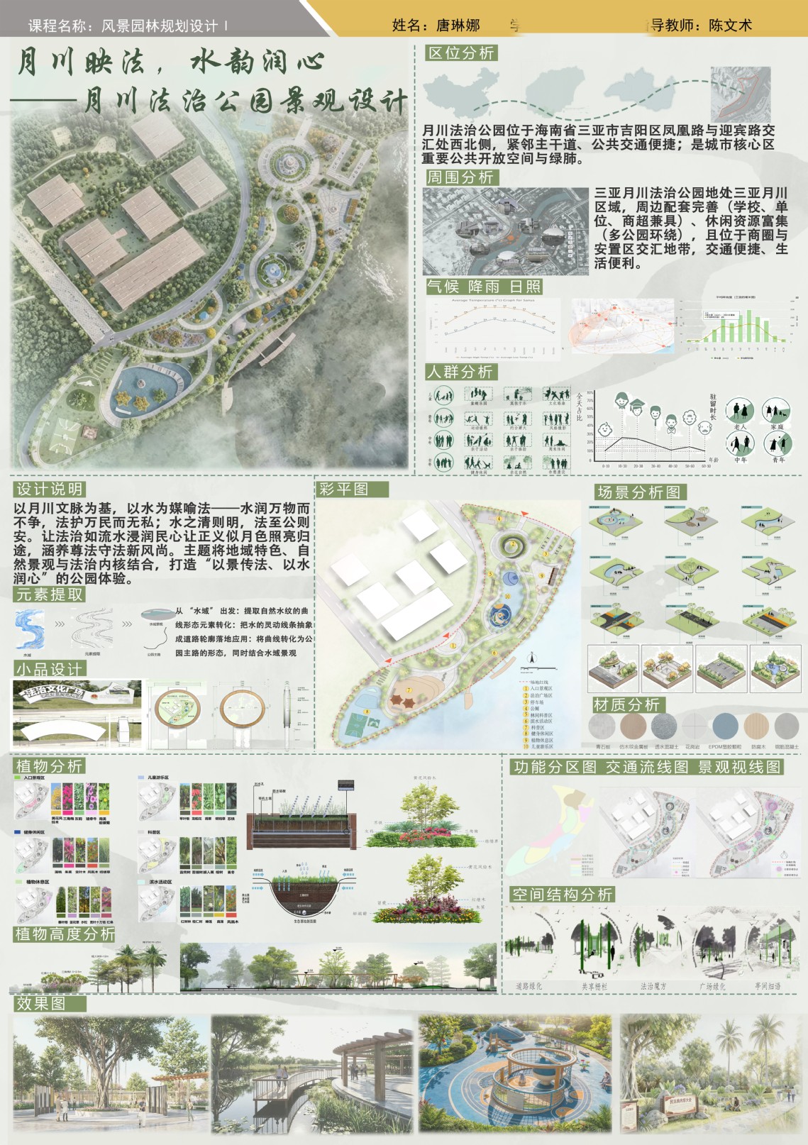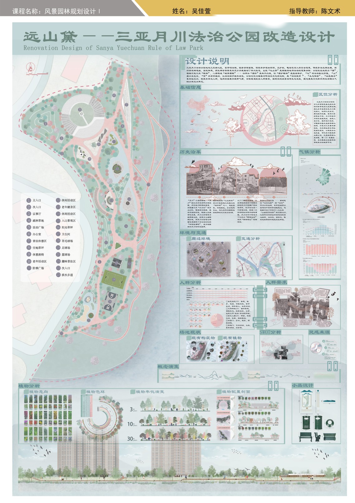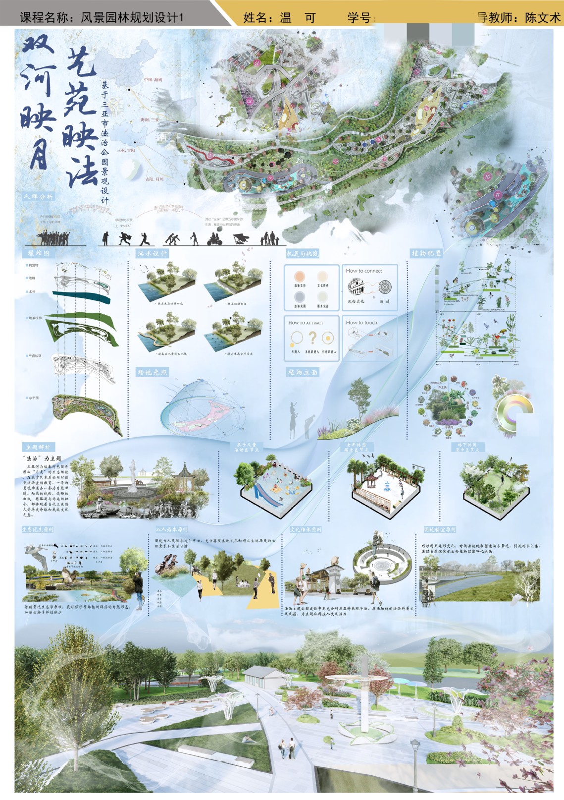 在新时代生态文明建设背景下,三亚学院风景园林专业核心课《风景园林规划设计Ⅰ》以“绿水青山就是金山银山”为育人主线,通过理论与实践深度融合的教学模式,培养学生服务城乡发展、投身生态建设的责任感与专业能力。