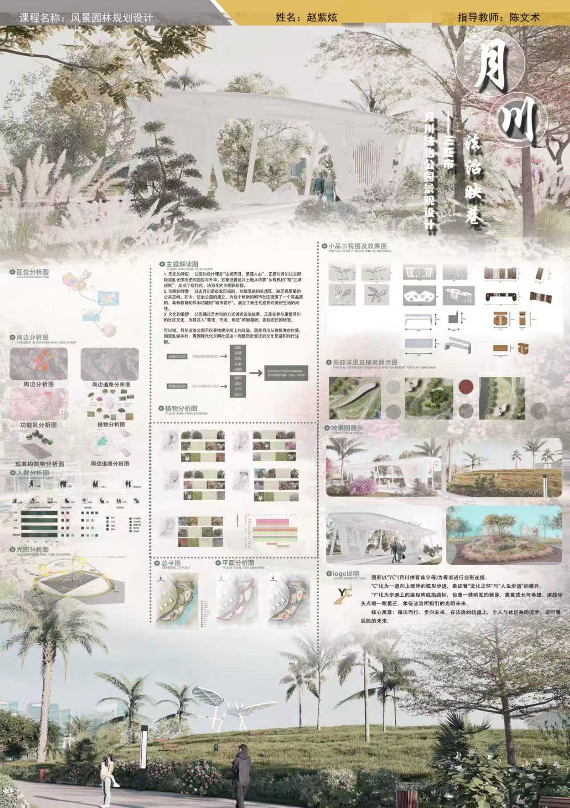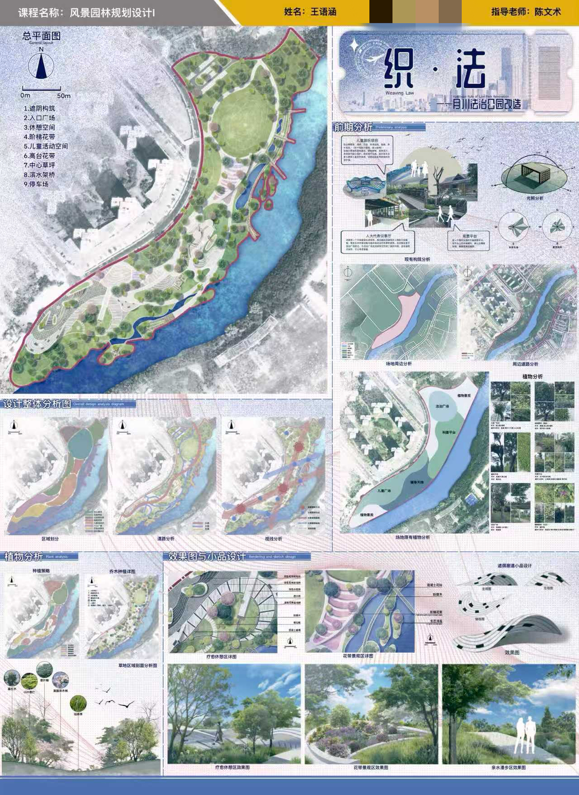 学生最终完成包括总平面图、专项分析图、植物配置、景观设施设计在内的系统方案,并通过多轮评图与公开汇报进行展示。课程考核注重过程与成果并重,全面评价学生的知识、能力与素质发展。