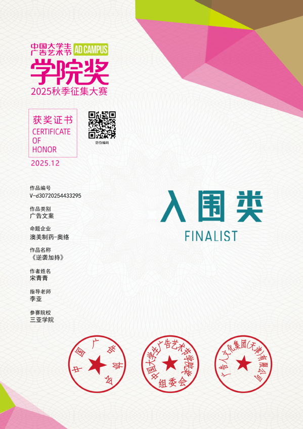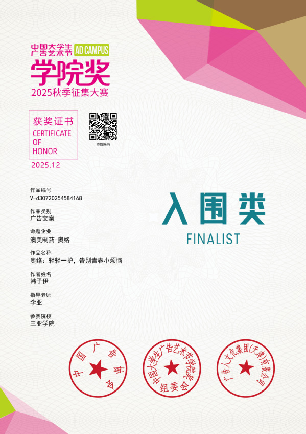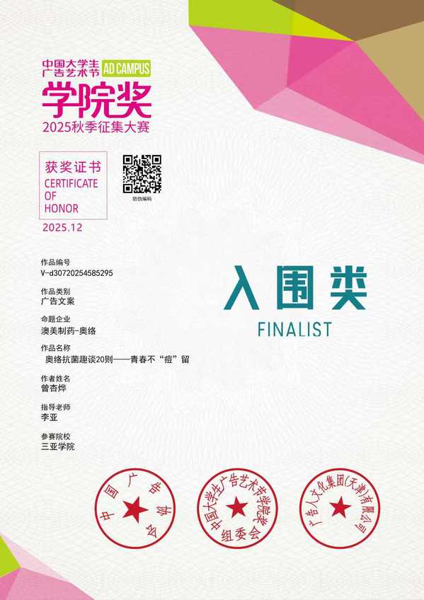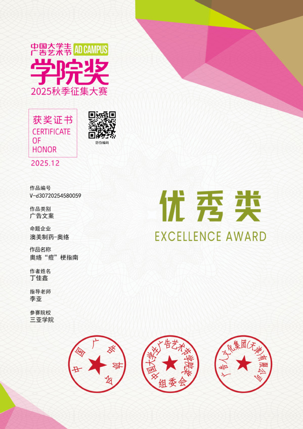 丁佳鑫在《学院奖》广告文案类别荣获优秀类