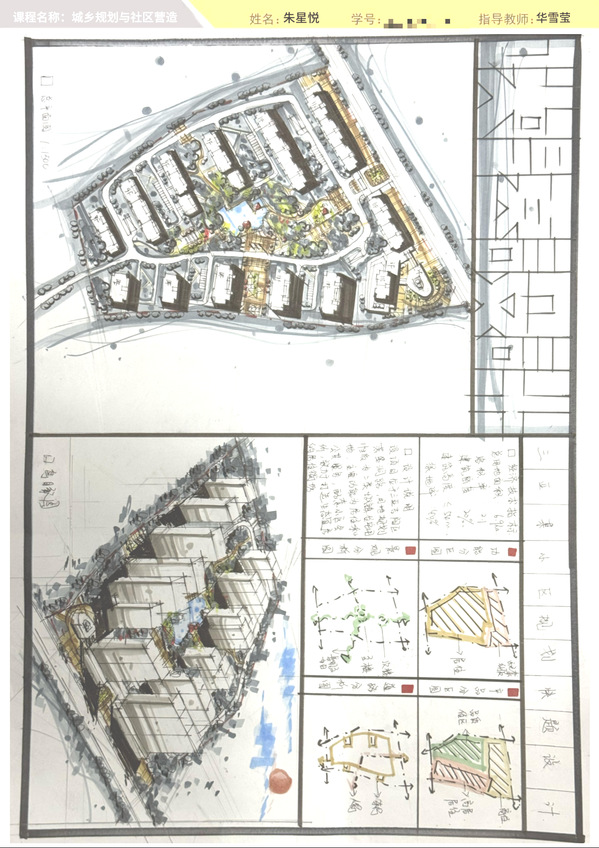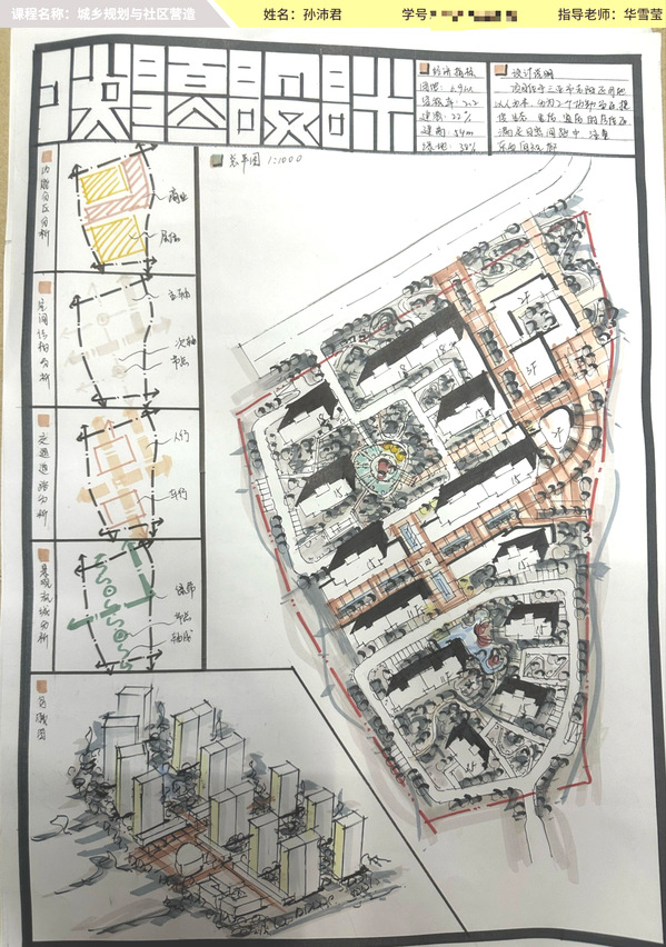 课堂内最激烈的“战场”当属期末综合性大作业“快题设计”。同学们依据《三亚市半岭温泉旅游度假区控制性详细规划》,把“容积率≤2.5、绿地率≥40%”等刚性条件转化为社区规划设计的空间语言,在A2图幅内完成总平面、交通分析、绿地系统、指标表与鸟瞰图。“先测算指标数据,画道路骨架,再调住宅组团,最后绿地‘穿棉袄’。”2202班朱星悦回忆作图逻辑。最终,60%的综合大作业权重,让每一笔线条都直接牵动总评,也与全国高校正在推广的“真实任务驱动+全过程考核”范式同频共振。在快题设计中,同学们用规划设计语言回答了‘什么是热带滨海社区’,更把‘人民城市’理念落在了图纸上,这与学校官网提出的‘服务海南自贸港建设,培养留得住、用得上、能担当的高水平应用型人才’目标高度契合。”