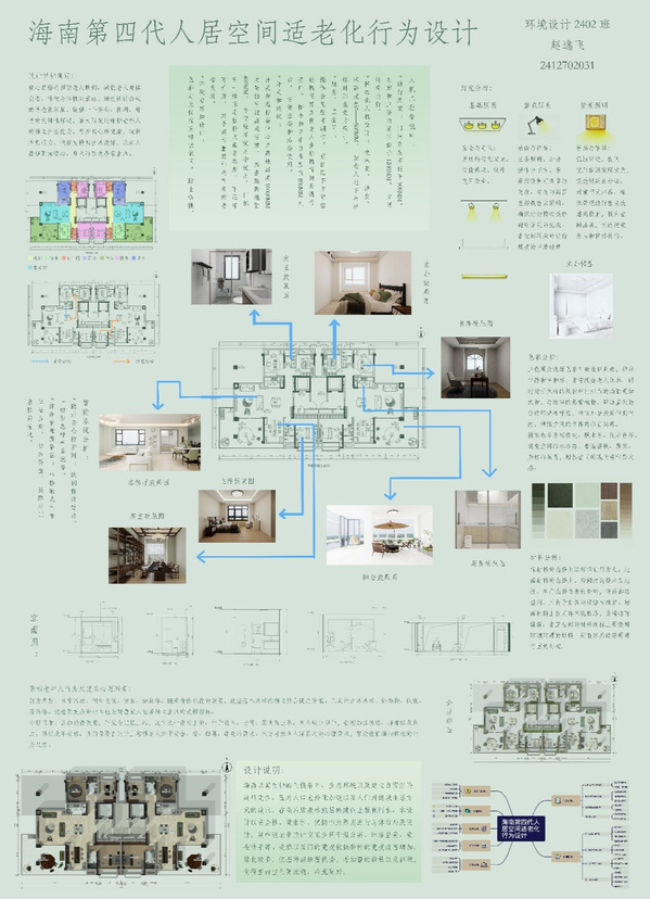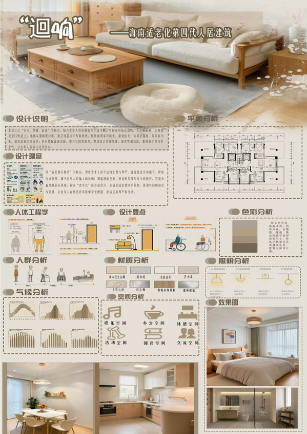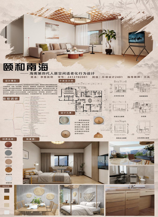 在老龄化程度持续加深、第四代住宅兴起的社会背景下,课程的实践价值尤为突出。据相关数据显示,我国60岁以上老年人口已突破2.8亿,适老化空间设计缺口巨大;而第四代住宅作为新型居住形态,其空间利用、功能适配等问题亟待专业解决方案。《人居行为与室内设计》精准捕捉这一社会需求,将海南第四代住宅空间适老化设计作为核心实践载体,通过产教融合的方式搭建起“高校—产业—社会”的联动桥梁,让课程教学直接服务于现实民生,既为行业培养了兼具人文素养与实践能力的专业人才,也为提升人居环境品质、促进社会和谐发展提供了学术支撑与实践路径。