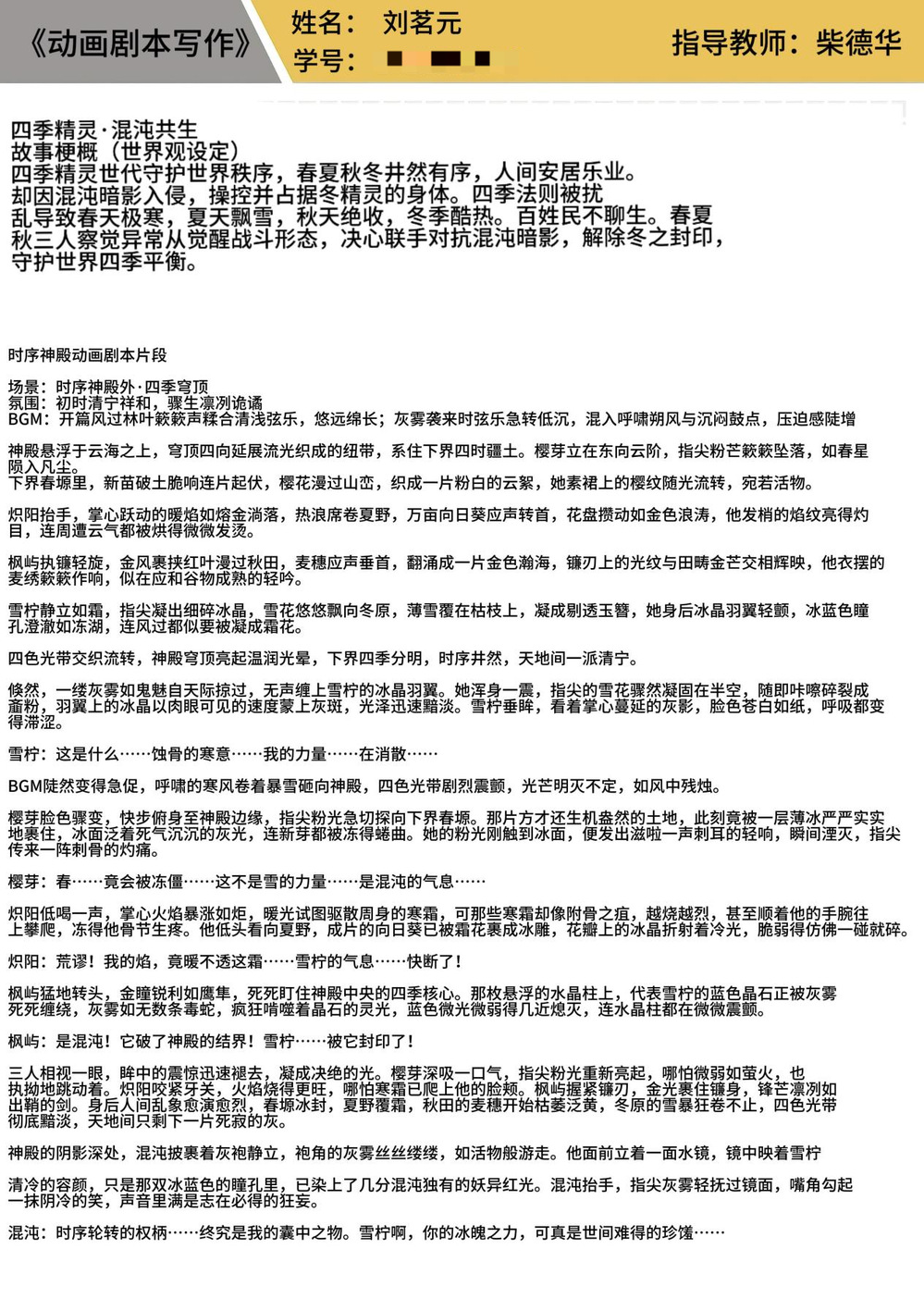 从一纸剧本的字斟句酌,到一组人物造型的反复打磨,再到一幅场景设计的精雕细琢,每个环节都是对学生创意能力、逻辑思维与实践功底的综合锤炼。课程中,学生们深耕多元题材:以传统文化为内核的剧本,搭配古色古香的人物服饰与中式场景,尽显东方美学韵味;以青春成长为主题的故事,辅以清新灵动的角色设计与校园场景,传递治愈力量;以未来幻想为方向的创作,则用前卫的人物造型与科幻场景,展现天马行空的想象力。文字与视觉的双向赋能,让每一部作品都兼具思想深度与视觉吸引力。