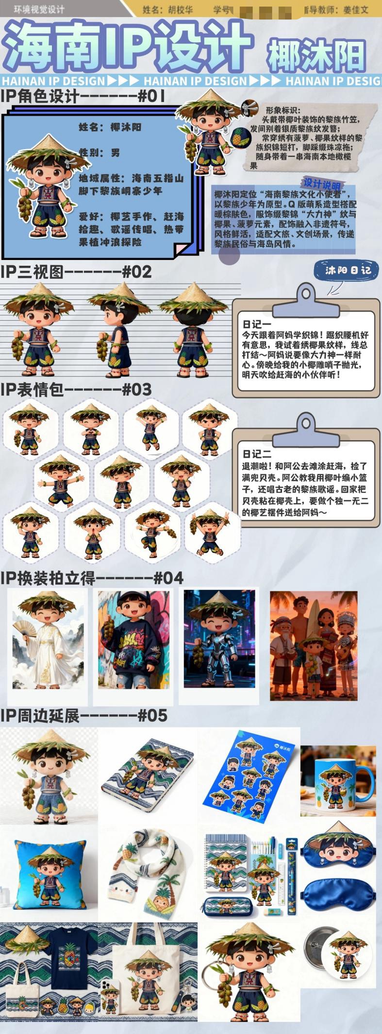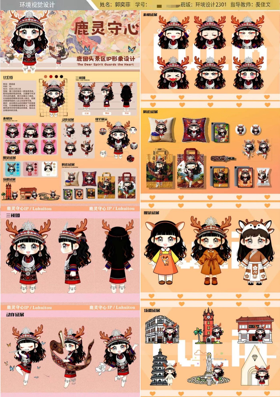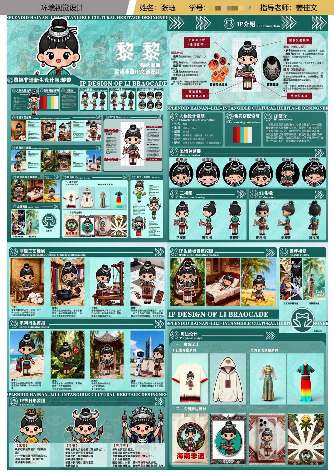 环境设计2301班学生以三亚学院书德楼为命题,运用AI技术构建了一套完整的导向系统设计,作品将校园文化元素与现代设计语言相结合,标识清晰、视觉统一,既满足了空间导航的实用需求,又彰显了校园人文气息;学生们创作的海南IP形象设计颇具亮点,该IP设计以“匠造新生高校非遗创新设计大赛”为训练目标,紧扣赛事视觉艺术、文化创意产品类投稿要求,将校园文化与非遗元素巧妙融合,学生们通过AI工具优化造型与色彩,打造出憨态可掬且富有辨识度的虚拟形象,并延伸设计了系列海报与周边产品,实现了艺术美感、非遗内涵与商业价值的兼顾,其中张珏、郭亦菲等同学凭借该系列IP设计作品,在此次大赛中成功获奖,用实践成果检验了课程学习成效;2303班学生聚焦公共设施与装置艺术,利用AI模拟不同材料质感与空间光影效果,设计的校园休闲装置既符合环境视觉设计的功能需求,又融入了人文关怀与新媒体技术应用,展现了扎实的专业功底与开阔的设计视野。